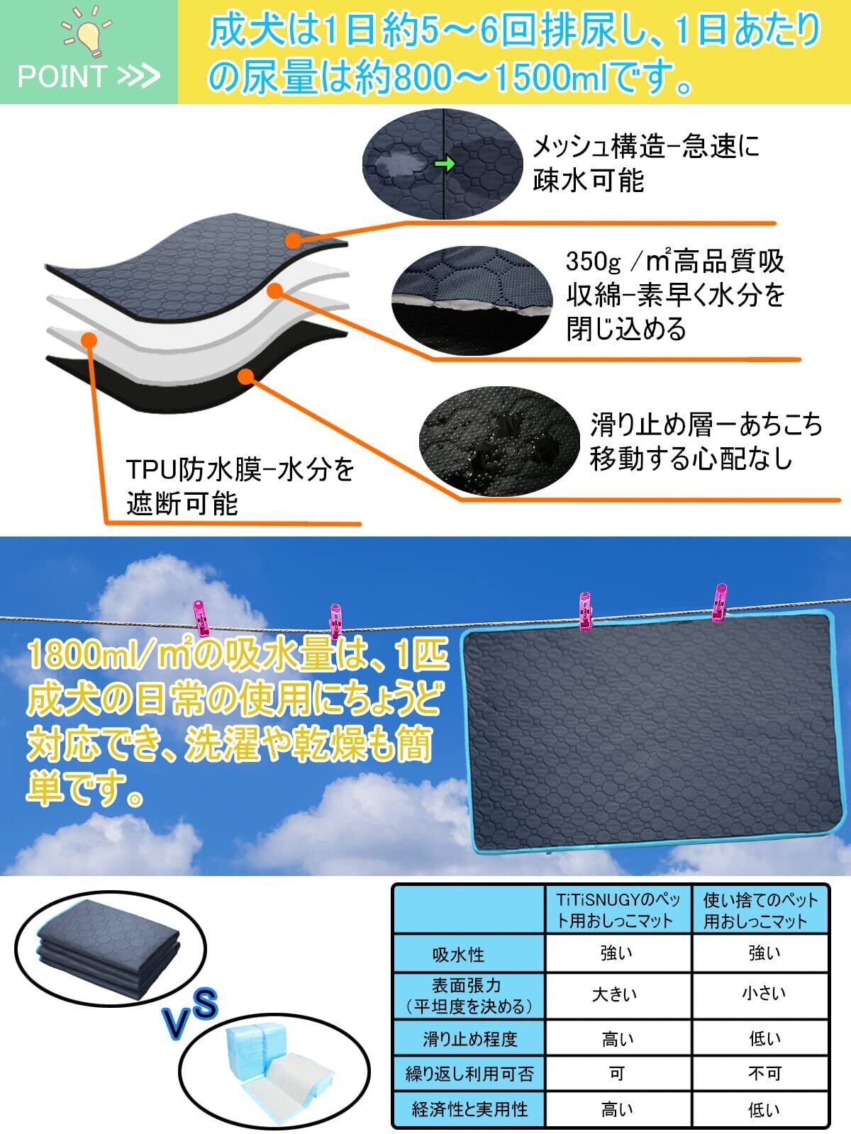 【繰り返し利用可能】一回使い捨てのおしっこシートよりもっと経済的で環境にやさしく。このペット用おしっこマットは柔らかく耐用性がよく、お手入れも簡単で、洗濯機に入れて洗えます。何度も洗濯しても、壊しにくい。速乾性がよく、繰り返し使用できます。折り畳み可能なので収納も便利です。(柔軟剤、および漂白剤の使用はお控えください)
