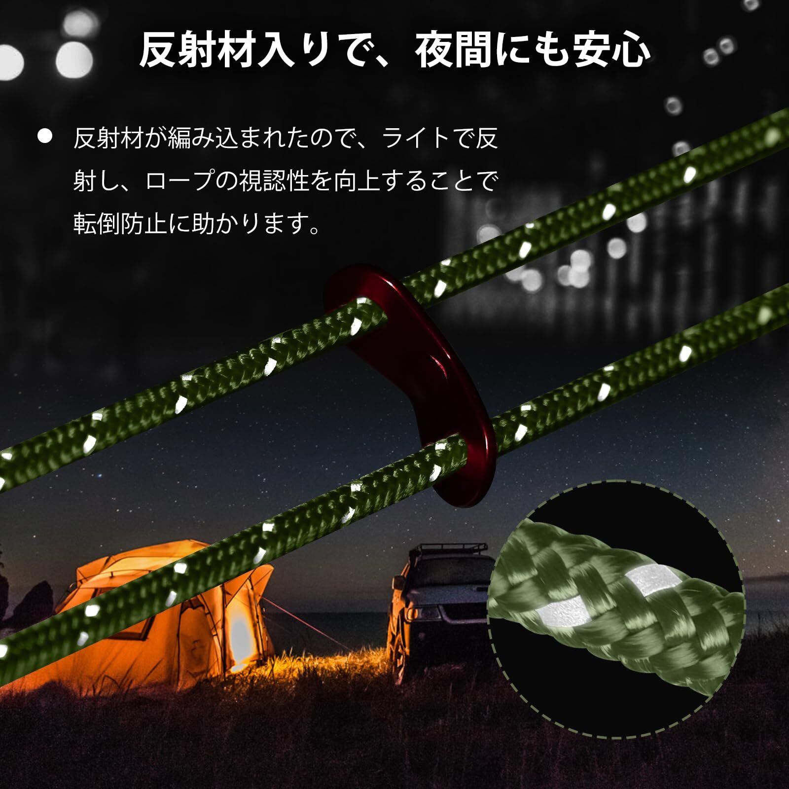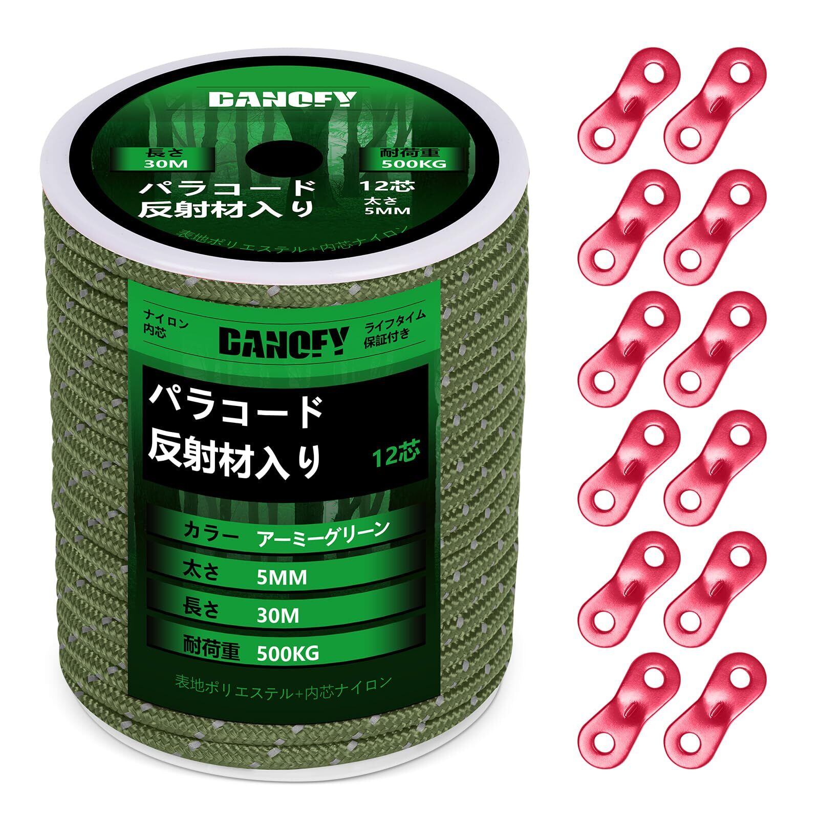 パラコード ガイロープ 5mm 反射 テントロープ - 耐荷重500kg 12芯 30m巻 自在金具付き ガイドロープ 細引き キャンプ タープ アウトドア アクセサリー用 紐 アーミーグリーン DANOFY