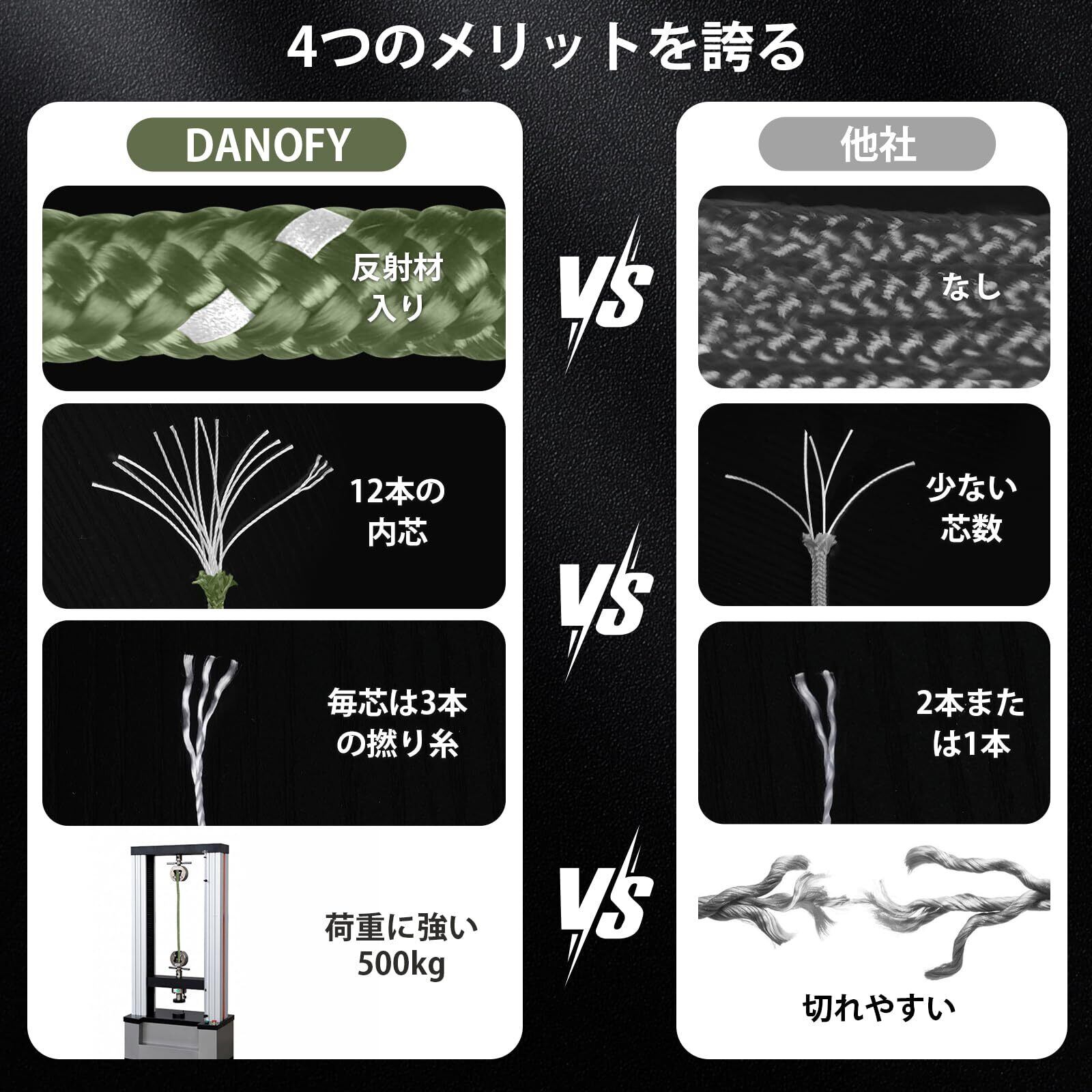 【耐荷重500KG】DANOFYテント用パラコードはナイロン製内芯とポリエステル製外皮からなり、各内芯がナイロン糸を3本撚り合わせて合計12芯で作られた張りに強いガイロープです。アウターが16ストランドで緻密に編まれておるこのガイロープ 5mmは柔らかくて軽量でありながら、耐摩耗性と耐荷重性が大幅に向上しています。この頑丈な構造のおかげで、弊社のテントロープは最大500kg(1100ポンド)の耐荷重に至って、ほとんどの使用中での破断がご心配なくなります。