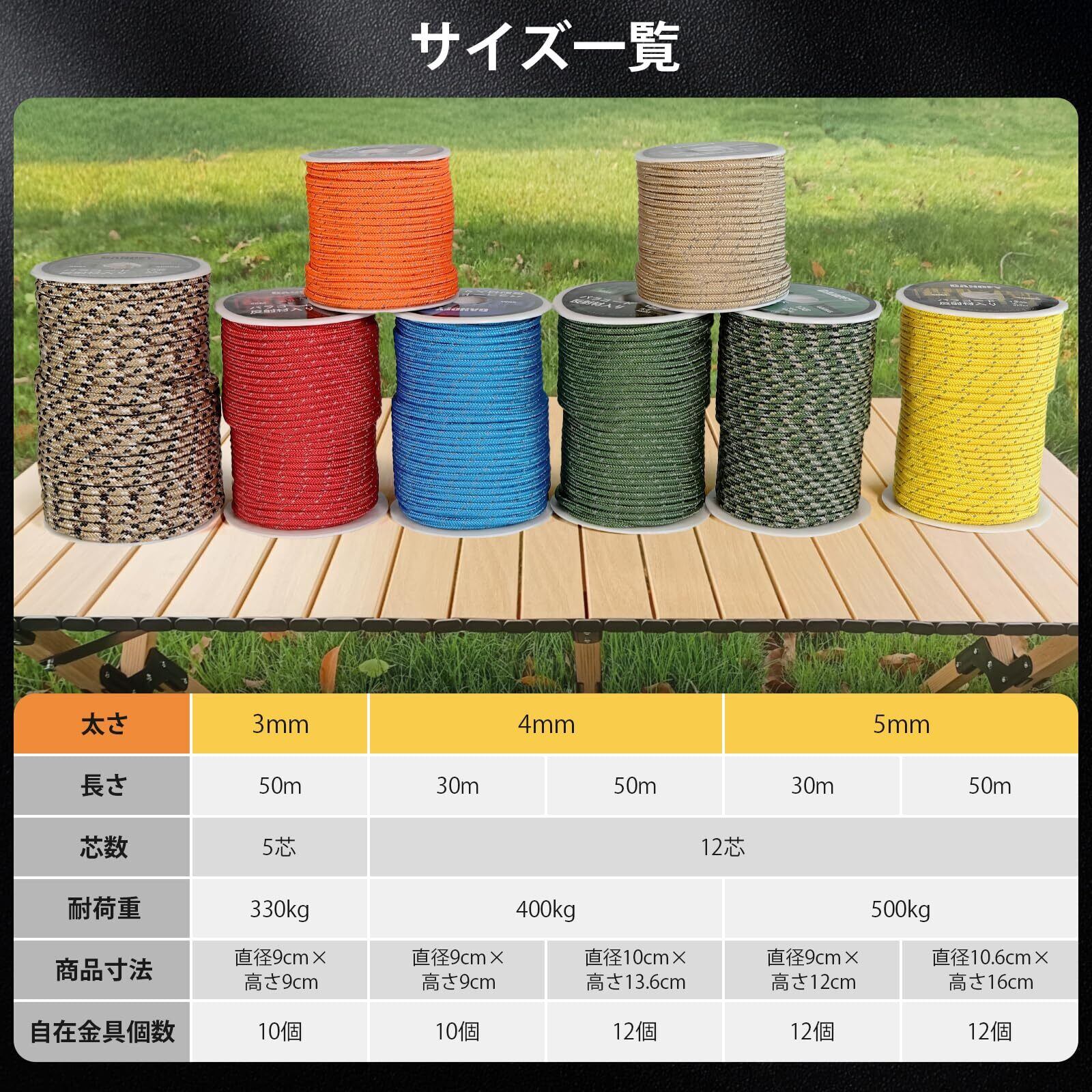 【自在金具付き】この細引き ロープはアルミ製自在金具を12個付属されており、テントやシェードなどを張る時、自由自在にパラシュートコードのゆるみの度合いを調節でき、風に当たってもしっかりとテントを止めます。また、自在ロープが複数本を接着剤で繋げるのではなく、抜群な技術で丸ごと1本で製造しておりますので、高耐久性を実現し、ガイラインの破断リスクも低減します。