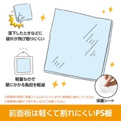 前面板には軽くて割れにくいPS板を採用。ご購入時には保護フィルムがついていますので、ご使用前に剥がしてください。