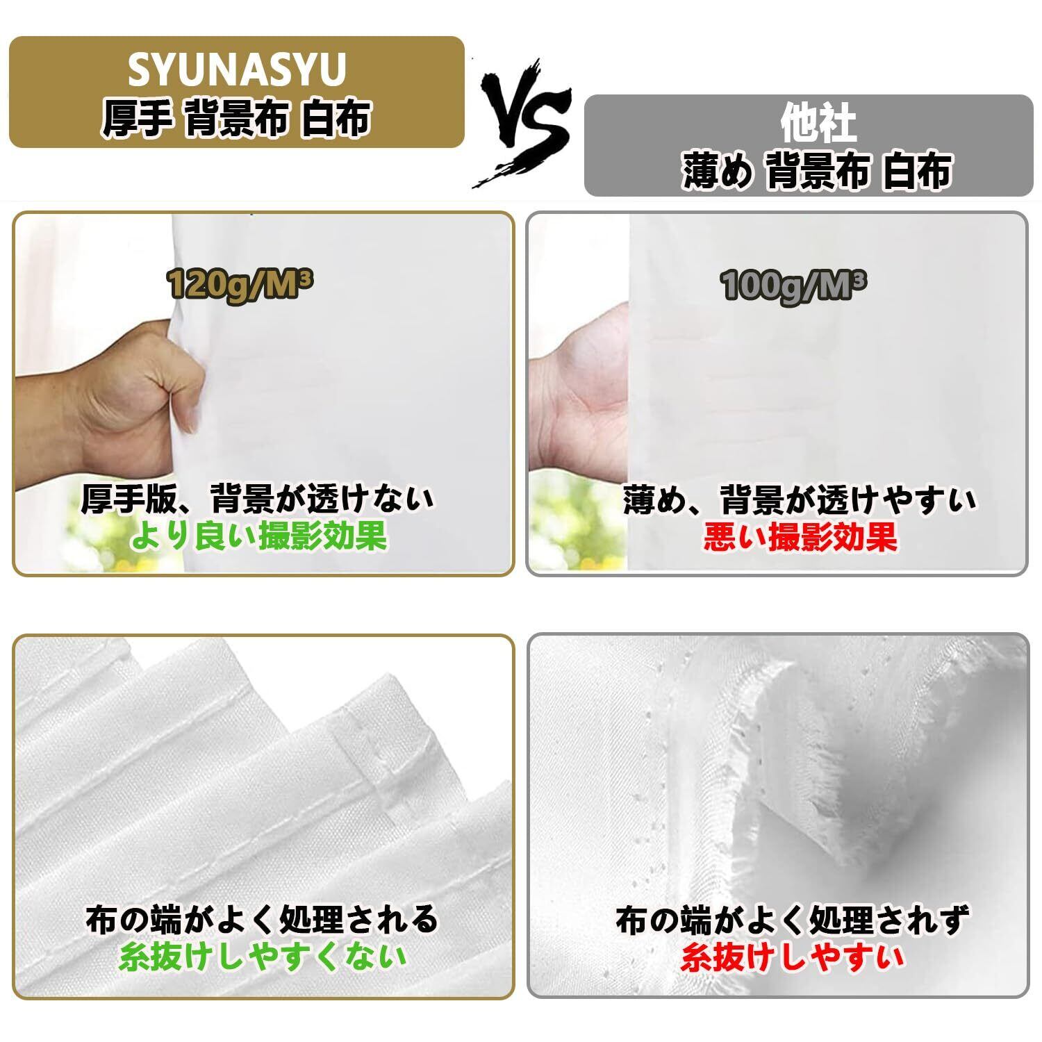 高品質で無反射の白背景布:背景布 白の上部に袋縫いデザイン、直接にポール対応可能(クロスバーは直径60mmまでに対応)で、垂れ感が良くて優れるスタジオ効果を提供することができます。また背景布は無反射で、余計な光の反射を防ぎ、光沢感を抑えます。撮影対象を自然に引き立てできます。注:白い布 背景布のフチがよく縫って処理してあり、糸抜ける心配はありません。