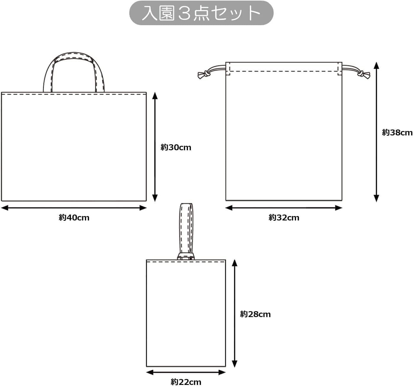 レシピに記載された作品のできあがりサイズ:【レッスンバッグ】縦約30cm×横約40cm・【上履き入れ】縦約28cm×横約22cm・【体操着袋】縦約38cm×横約32cm /ご注意:こちらの商品はオックス生地とレシピのみのセットです。レシピの材料に記載がございます、裏布(約108cm巾×1m)・接着芯(約90cm幅×70cm)・丸ひも(約5mm幅)・ミシン糸などはお客様のお好きなものを別途ご用意ください。