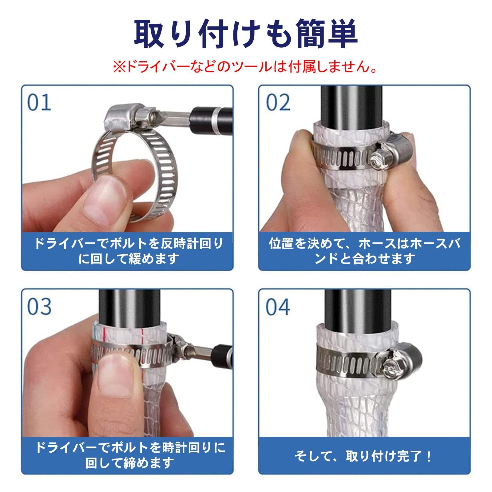 【頑丈な設計・強力固定】 ホースクランプは素晴らしい性能、高靭性、抗酸化、耐腐蝕、強力など優れた機能を備えていますので、ホースバンドの高い締付力でホースを傷めず、しっかり固定することが出来ます。まず、ホースにセットしてから、ホースクランプを締めてください。水漏れも簡単に防ぐことができます。取り外し可能なデザインですので、繰り返して使ってもいいです。