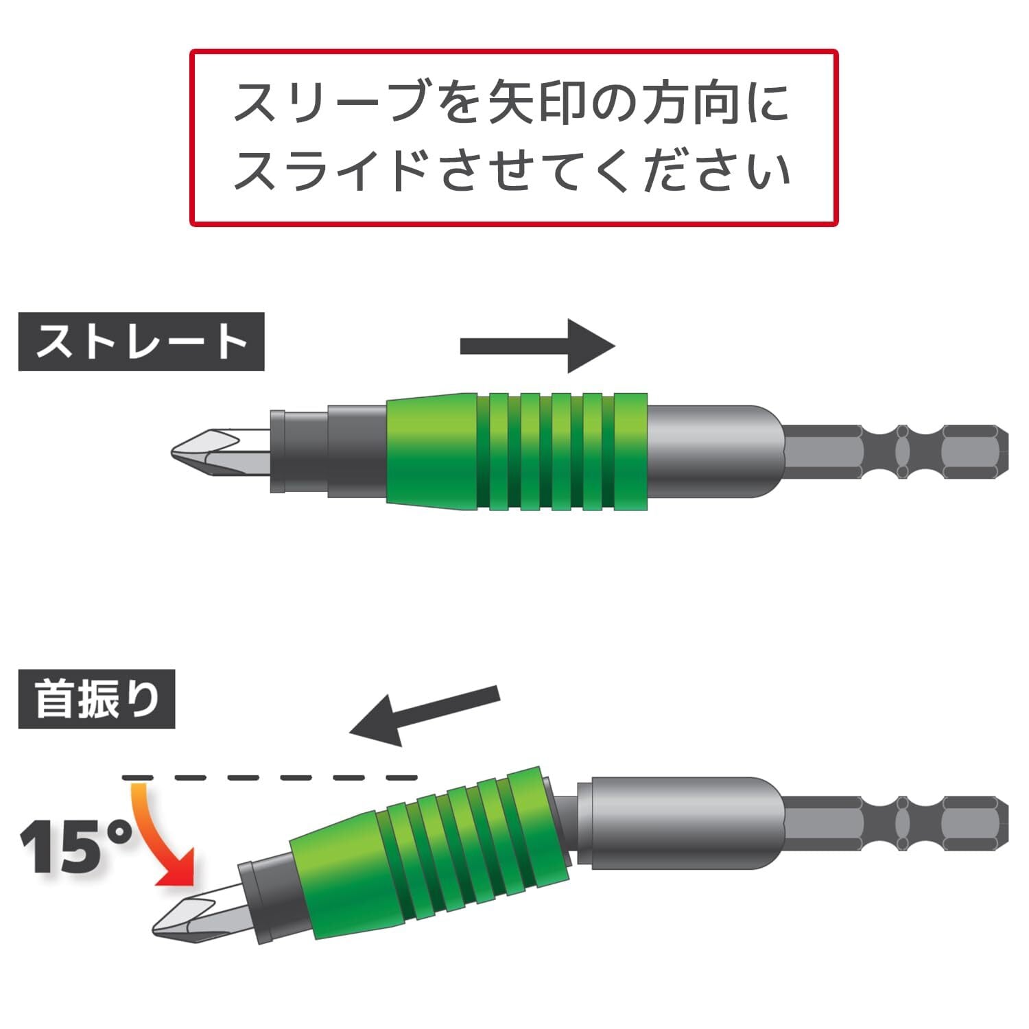 壁際のネジもはずせるジョイント付きエクステンション。【特徴】中折れ式で15度傾けることができます。100㎜の延長ビットとしても使用できます。インパクト対応(短時間)。※電動工具を使用する際の注意1数十秒連続して使うと関節部分が高温になるため、潤滑油等で冷却しながら作業してください。2首振り状態で使用する際は先端のブレに注意してください。3溝がないタイプのビットは保持できません。【用途】コーナーや壁際のネジ外しに。【仕様】全長:100mm直径:15mm重量:60g材質:本体/高炭素鋼、スリーブ/アルミニウム