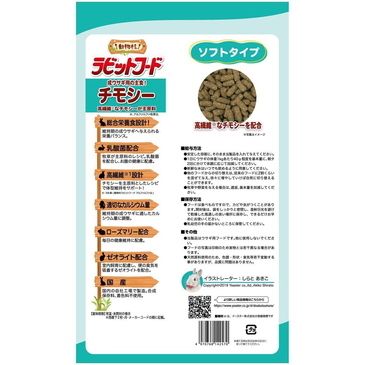 成ウサギから使用できるソフトタイプの主食。チモシーを主原料に、オリゴ糖と乳酸菌を配合することでお腹の健康維持に配慮。またチモシーやアルファルファに含まれる繊維により、ウサギの体型維持をサポート。さらには成ウサギに適したカルシウム含有量に調整し、健康維持のためにローズマリーを配合。