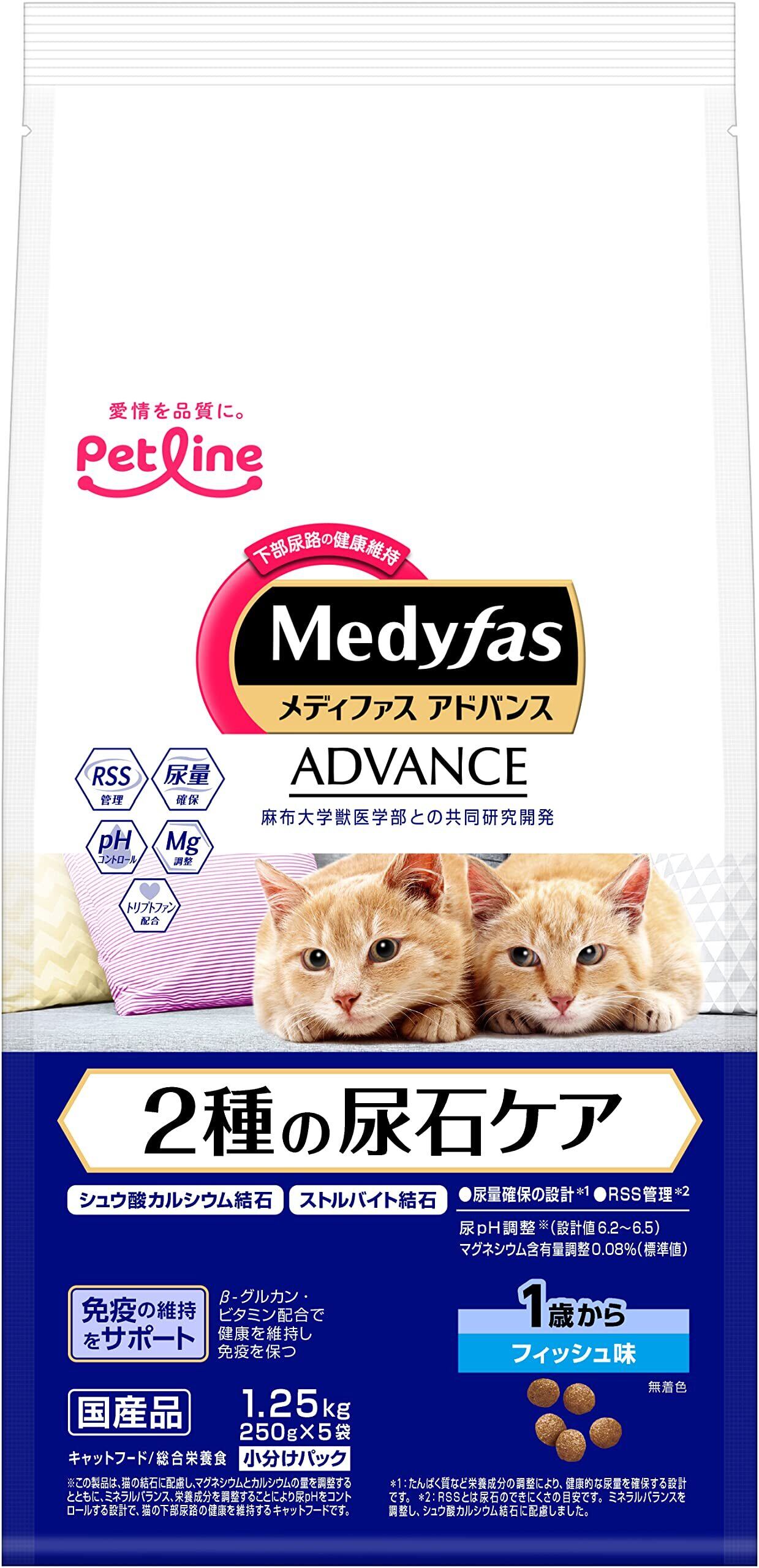 メディファスアドバンス キャットフード 2種の尿石ケア 1歳から フィッシュ味 【シュウ酸カルシウム/ストルバイト/国産/アルミ小分け」 1.25kg(250g×5)
