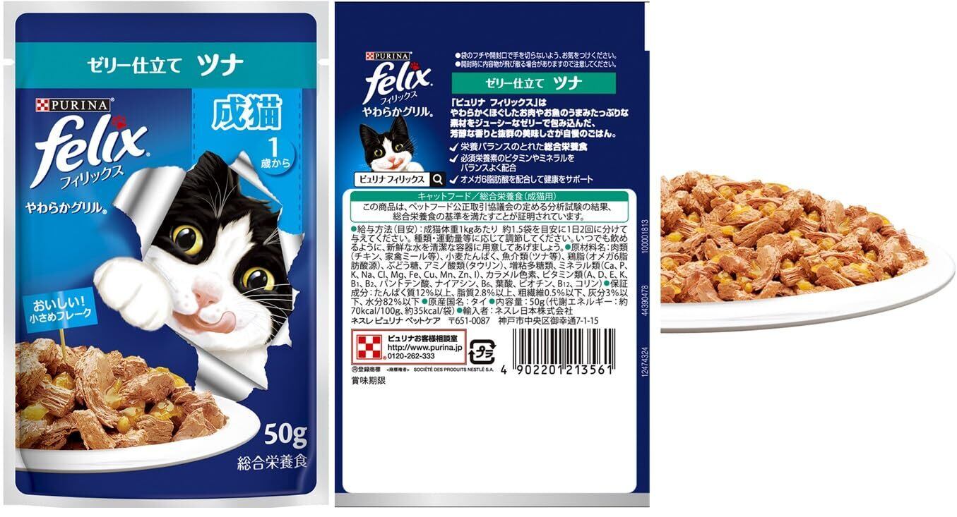 やわらかくほぐしたお魚のうまみをジューシーなゼリーで包み込んだごはん。 お魚大好きネコさんにツナ・サーモン・あじの3種類が入ったバラエティパック。 使用方法 成猫体重1kgあたり 約 1.5 袋を目安に1日2回に分けて与えてください。種類・運動量等に応じて調節してください。いつでも飲めるように、新鮮な水を清潔な容器に用意してあげましょう。