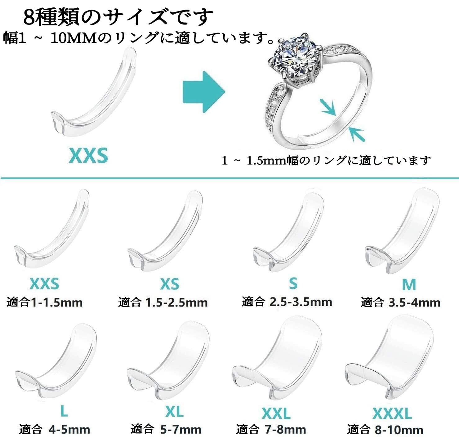 【セット内容】8サイズが。指輪調節具のサイズ:1.5mmXXS*1、2.5mmXS*1、3.5mmS*1、4mmM*1、5mmL*1、7mmXL*1、8mmXXL*1、10mmXXXL*1。幅は1mm~10mmの指輪に対応
