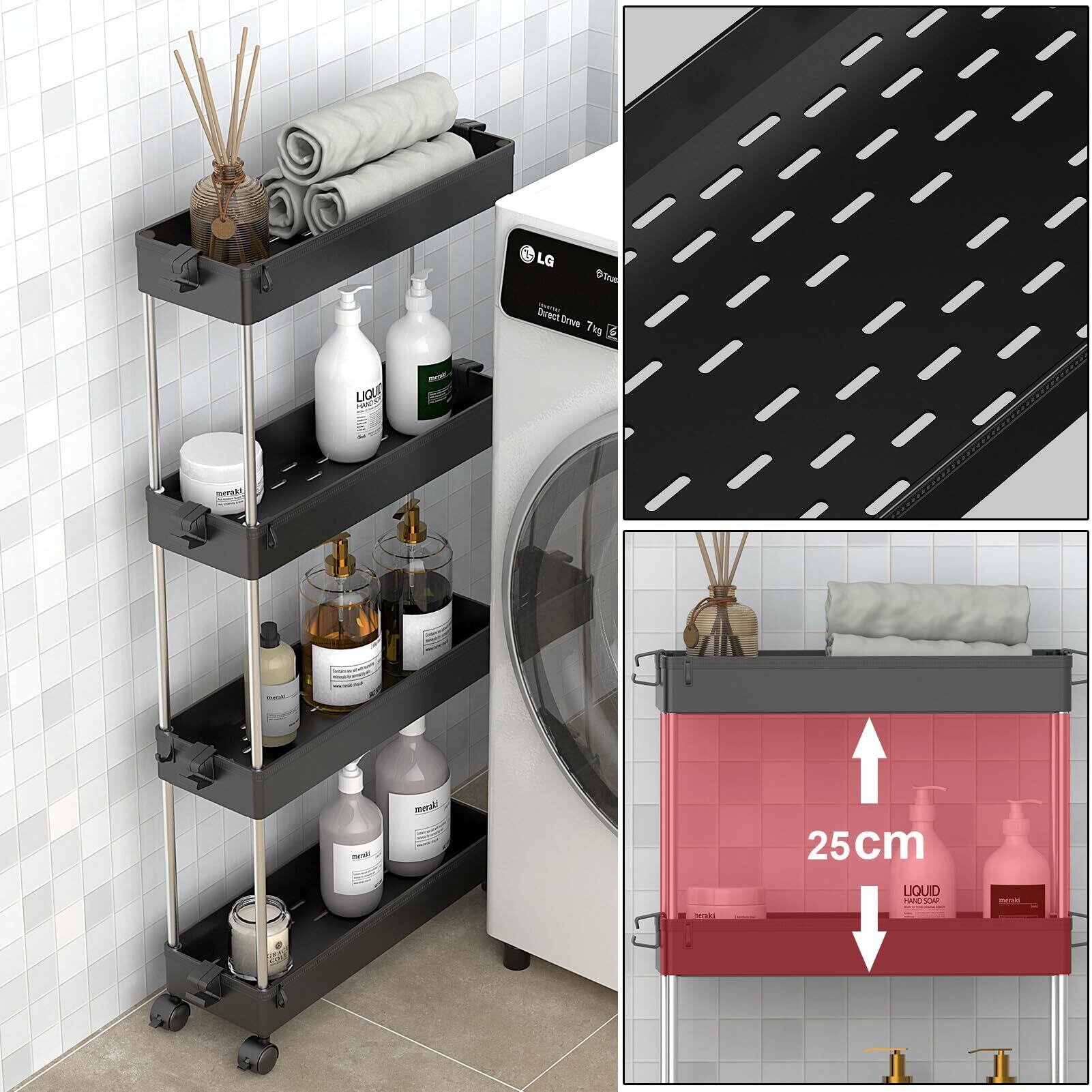 【頑丈&耐久性】軽量で丈夫な素材でできたワゴンで、ご底板は穴付きで通気性がよく、お掃除が簡単で、湿気が多い場所でも安心。また、落下防止フレーム付きがあり、小物や割れ物等落下の心配なく、ジャムなどの小さいものペットボトルなどの大きな物まで収納可能です。