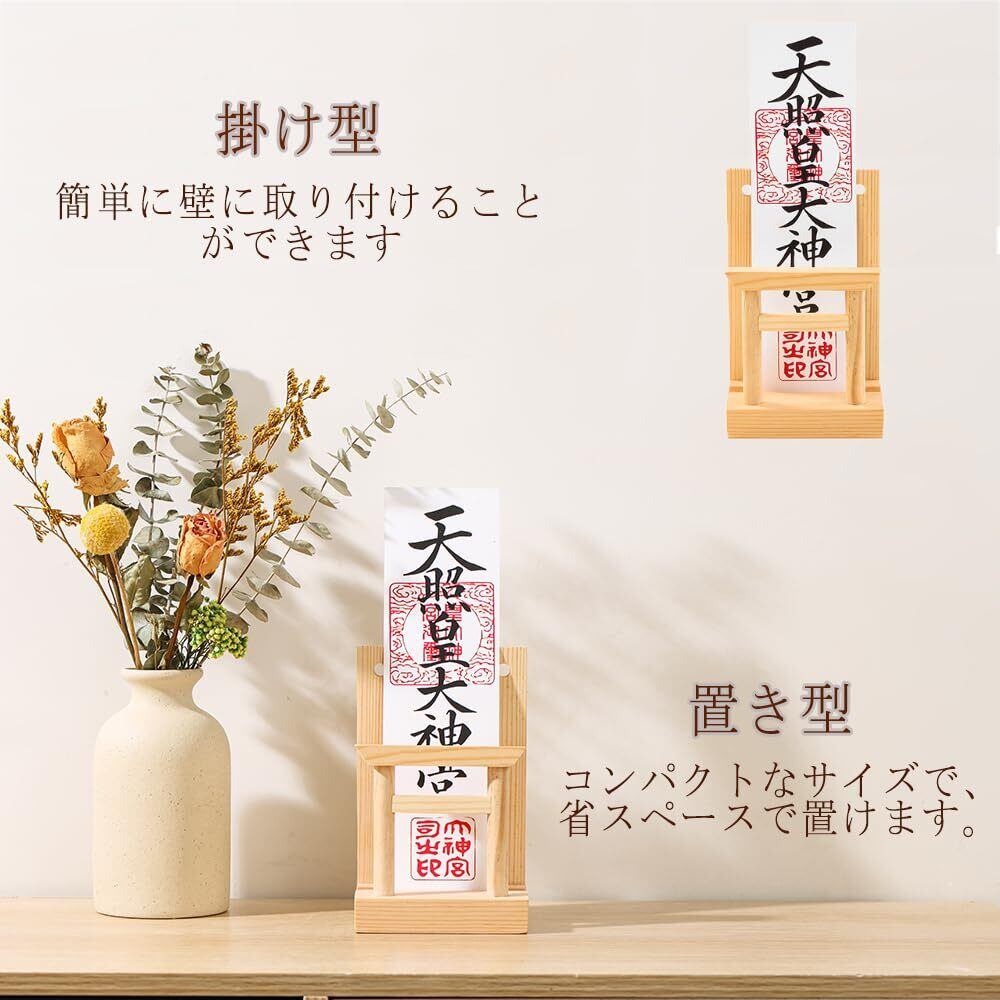【2wayで使えるお札立て】洋風のリビングにも違和感なくお祀りできる鳥居付きお札立 てです。置き型、壁掛けどちらとしてもお使いいただけます。通常配られる頒布大麻を1~ 2枚お祀りすることができます。通常配られる頒布大麻を三枚お祀りすることがでます。