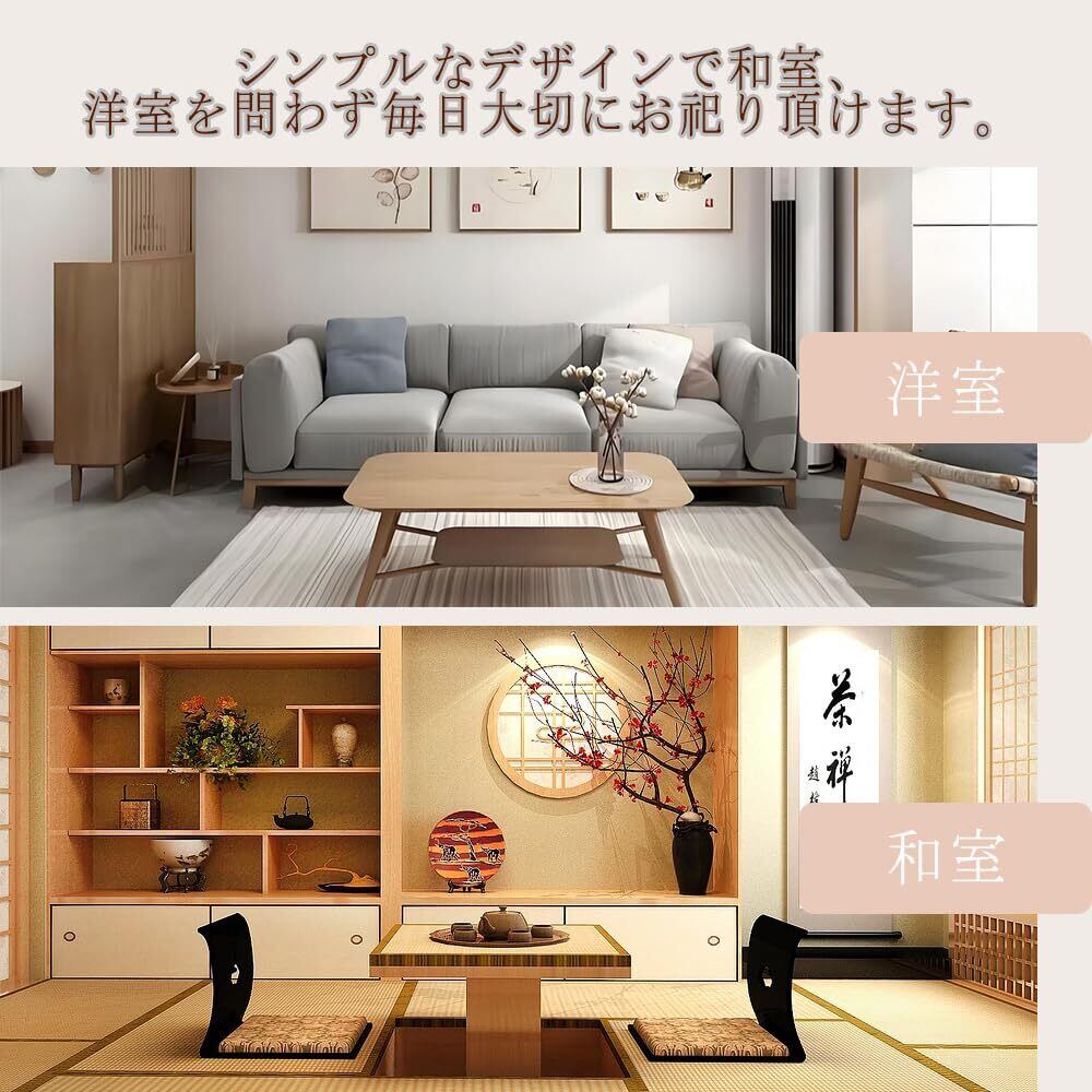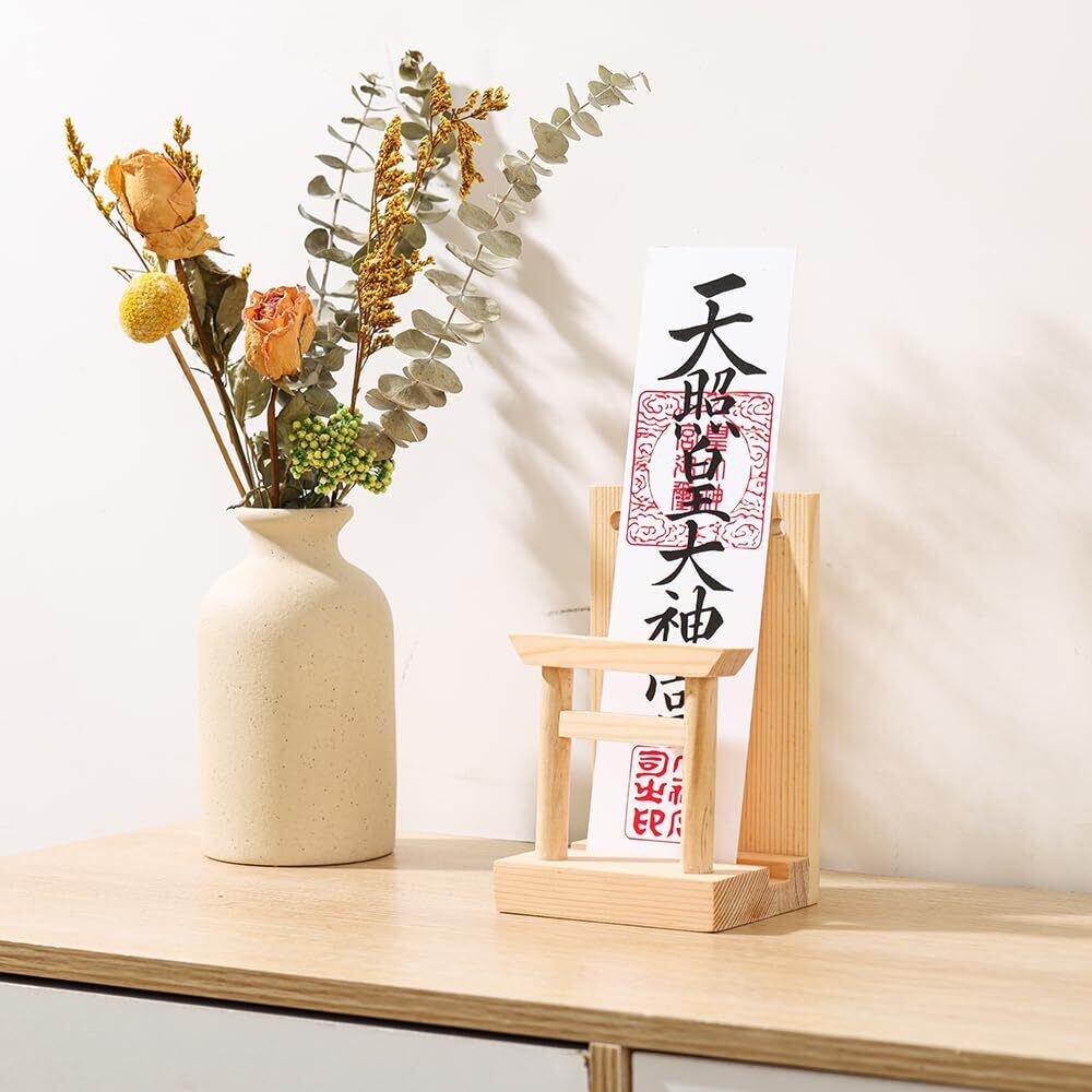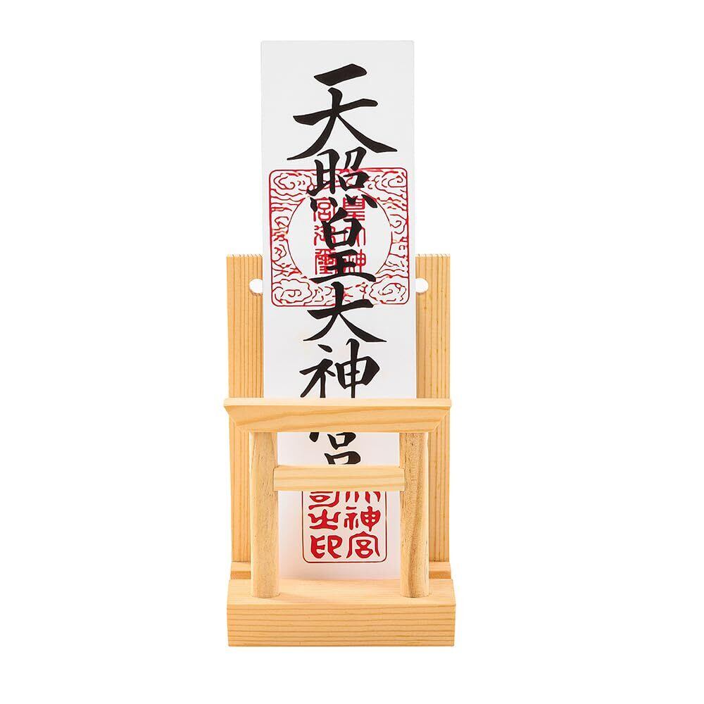 神棚の中央には白松の鳥居、神社のような神聖な雰囲気たっ ぷりです。神社やお寺から授与された御札を大切にお祀りします。朱印帳立てとしてもご 利用いただけます。洋風のリビングにも違和感なくお祀りできる鳥居付きお札立 てです。置き型タイプなので壁に穴を置ける必要はございません。工具不要の簡単な組み立て式なので、不要な時は小さくたたんで収納きます。通常配られる頒布大麻を1~ 2枚お祀りすることができます。