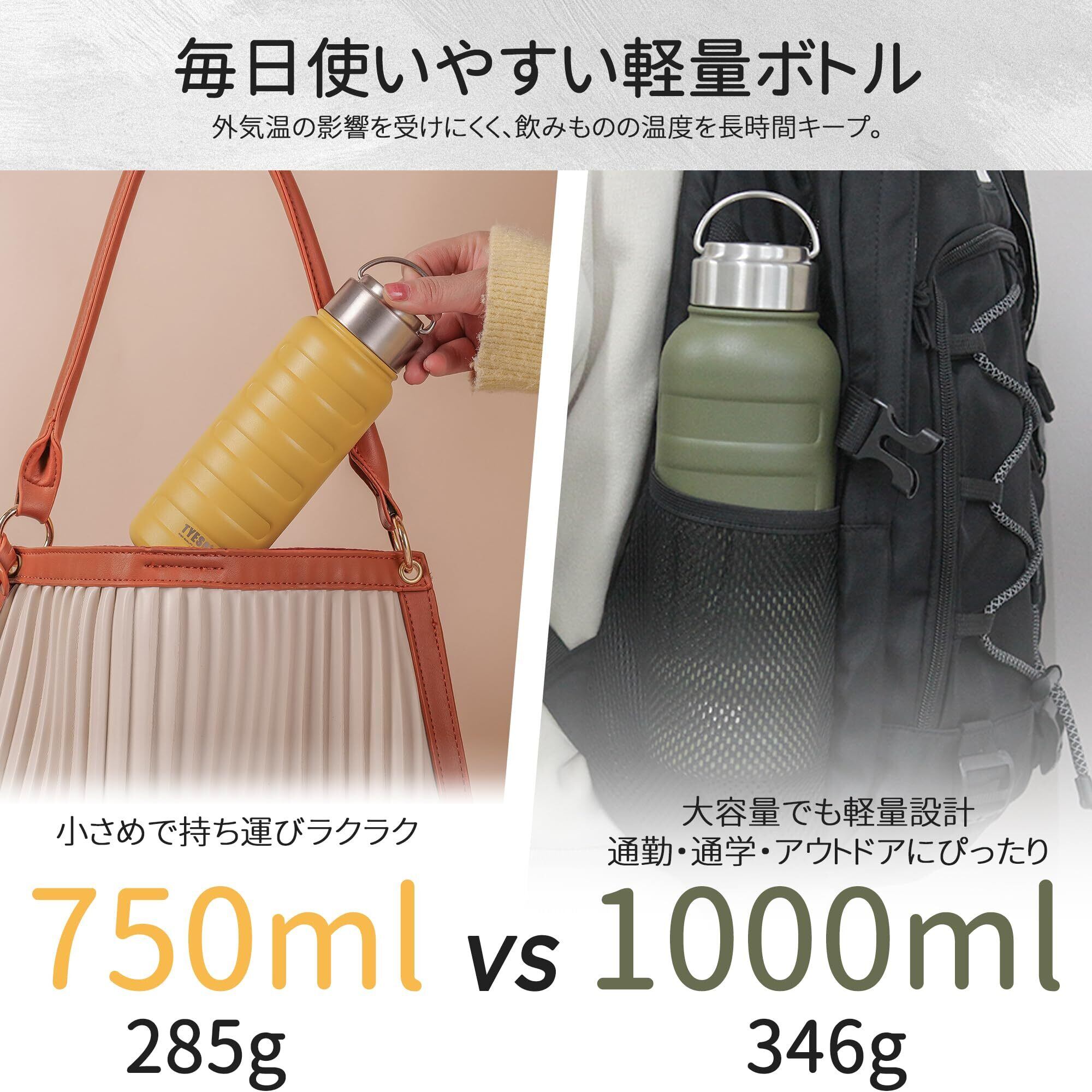 「あなたの飲み物を理想的な温度でキープ!」この【在庫セール】TYESO 水筒は、真空断熱構造を採用し、ホットもコールドも長時間そのままに保つことができます。大容量1000mlで、運動中やアウトドア活動、学校やオフィスでも大活躍です。