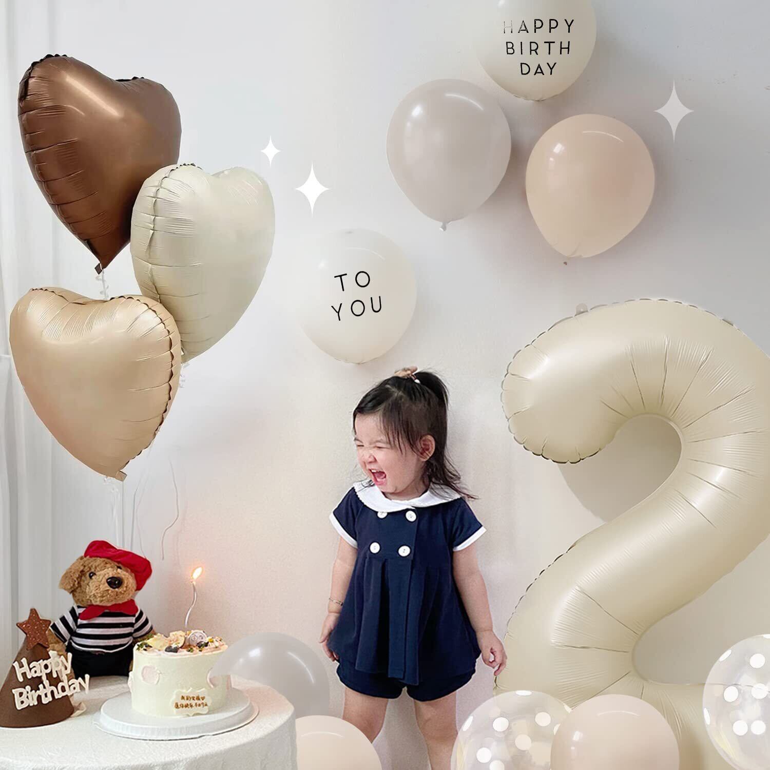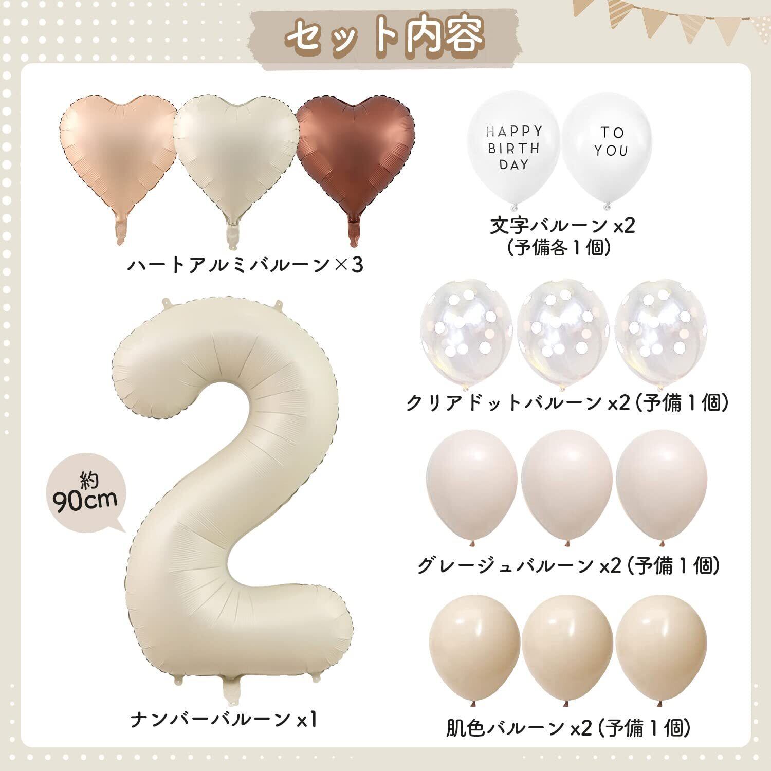 【飾りセット内容】①ナンバー2アルミバルーン×1個 ②ハートアルミバルーン×3個(クリーム色,肌色,チョコレート色) ③「HAPPY BIRTHDAY To You」文字バルーン×各2個 ④グレージュバルーン×3個 ⑤肌色バルーン×3個 ⑥クリアドットバルーン×3個