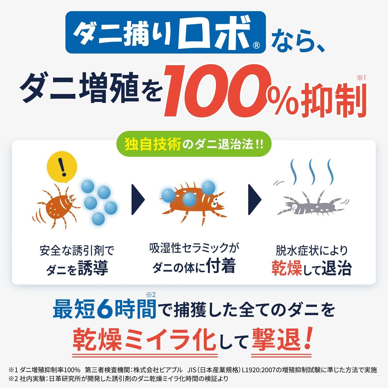 ダニ捕りロボは、ダニが好む香りで誘い寄せ、粘着式ではなく独自の乾燥技術で最短6時間でミイラ化。逃がさず確実に退治し、ダニの増殖も100%抑制。※ JISに準拠した「防ダニ試験(インテリアファブリックス性能評価協議会)」(調査機関:株式会社ビアブル,試験実施期間:2015年9月8日〜10月20日)