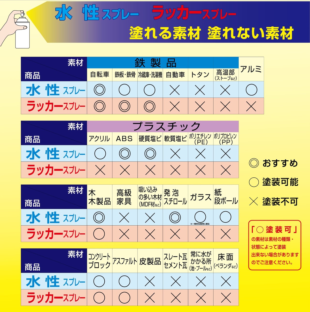 【塗装時の注意】 ■[使用前に良く振ってください]使用前に容器を良く振ると、カラカラと音がします。その状態で約30秒以上続けてください。 ■[使用後は]噴出口が詰まらないように、容器を逆さにして2秒程度空吹きし、噴射口を良く拭いてから蓋をして下さい。 ■[厚塗りはしないで]一度に厚塗りをせず、やや薄めにまんべんなくを心がけて、2~3回程度塗り重ねてください。 ■[保管時の注意]破裂防止のため、容器のサビ易い場所や直射日光が当たる場所は避けて保管してください。また、温度の高くなる自動車内や暖房器具付近も避けてください。 ■[捨てる時は要注意]廃棄時のみ、必ず中身を使い切ってからガス抜きを行ってください。※スプレーボタンを外し、ノズルをキャップ上にある凹凸にはめ込み押せば、残りの中身を出すことが出来ます。 ※処理作業前、処理方法については事前に各自治体へ確認を行い、各自治体に合わせた処理を行って下さい。