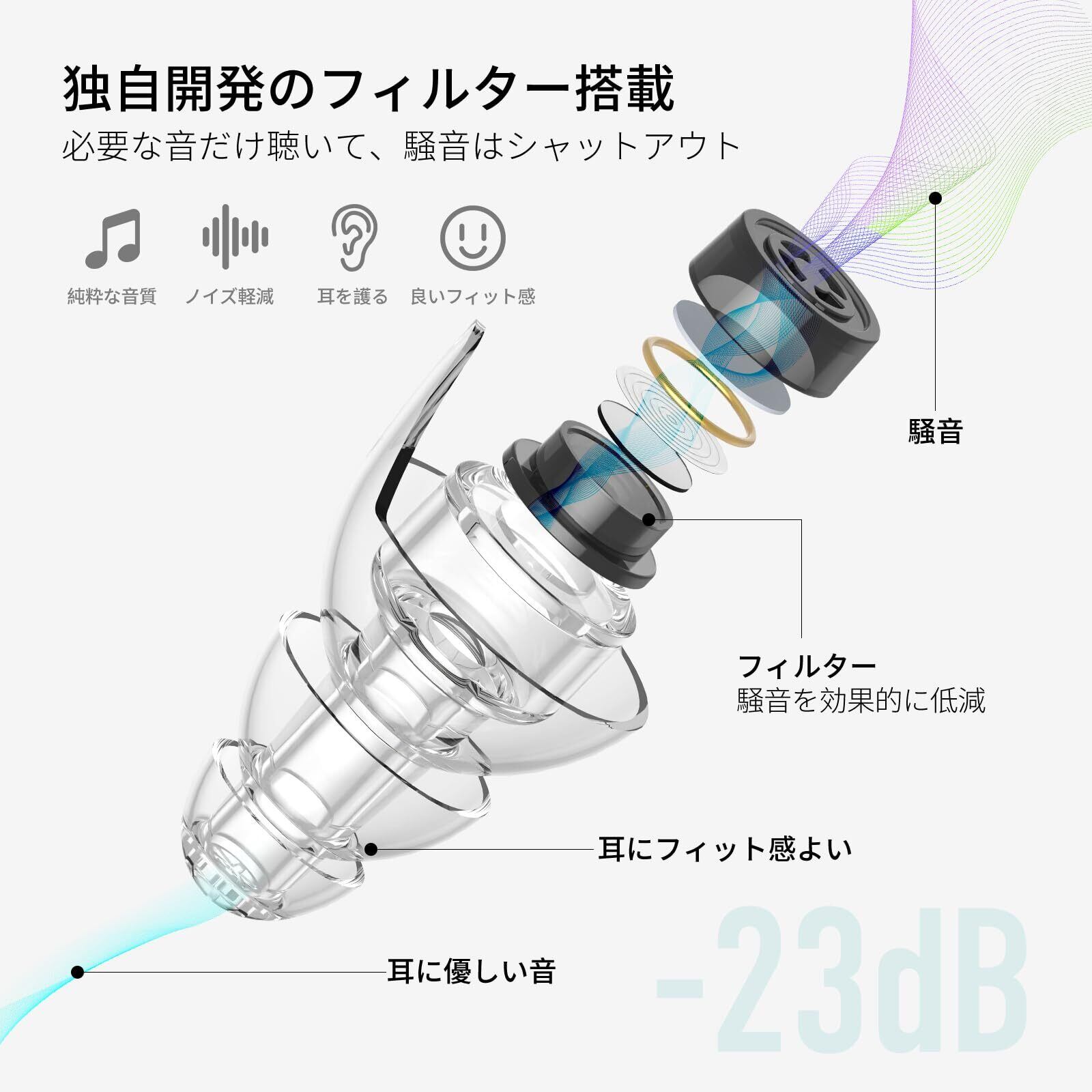 【2種類の耳栓 快適なつけ心地】2種類の耳栓を入れ、自分の耳に合う耳栓を選んでご利用いただけます。また、色の異なる2ペアのフィルターをご用意、自分の好みに合わせて自由に組み合わせられます。耳栓は、人間工学に基づいた画期的なデザイン、ユニークな形で耳穴に吸い付くようなフィット感があり、快適なつけ心地です。また、シリコン素材を採用され、柔軟性抜群で、長時間装着しても耳が痛くなりません。中空設計で、良好な通気性も発揮して、装着時の不快感や、耳に水が入ったような閉塞感はありません。