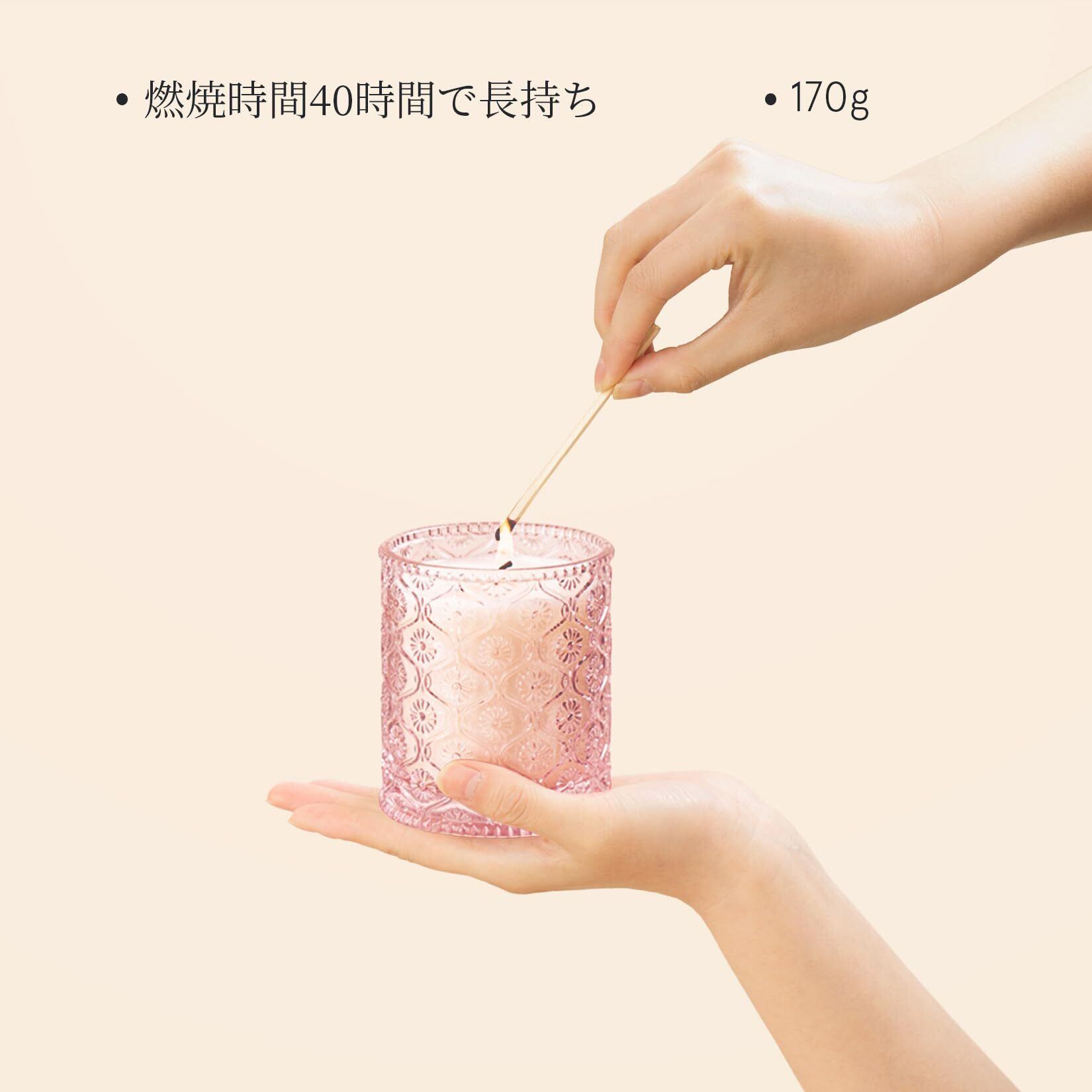 「約40時間の燃焼時間で長く楽しめる!」170gの上質なキャンドルは、たっぷり楽しめる燃焼時間を提供。心地よい香りを長時間にわたりご堪能いただけます。リラックスタイムやお友達との集まりに最適です。