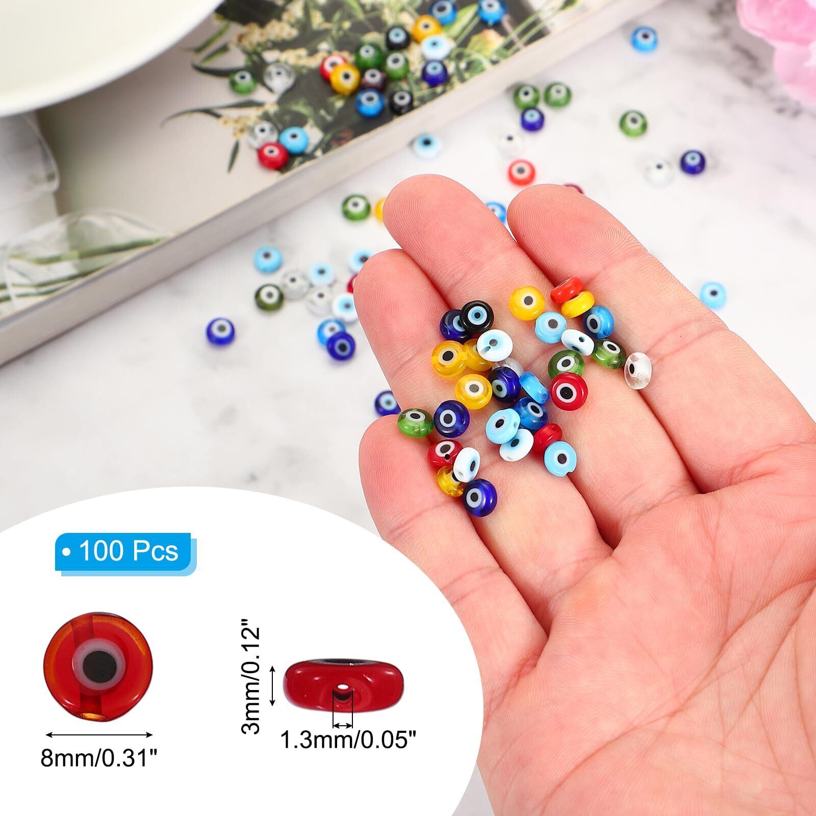 素材:ガラス;カラー:レッド;全体サイズ:8 x 3mm / 0.31 x 0.12"(直径*厚さ);穴の直径:1.3mm / 0.05";パッケージリスト:100個 x フラットイービルアイビーズ