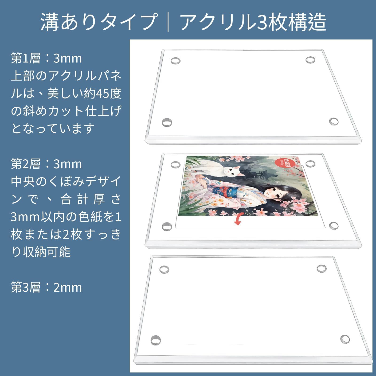 45度斜めカット&縦横兼用:標準色紙サイズ(242×272mm)に対応。ビス止め式、フレームレスデザイン&45度斜めカット仕上げのアクリルを採用し、作品が浮いて見えるモダンかつ高級感のあるデザイン。色紙はもちろん、チェキワイドやポストカードにも対応。