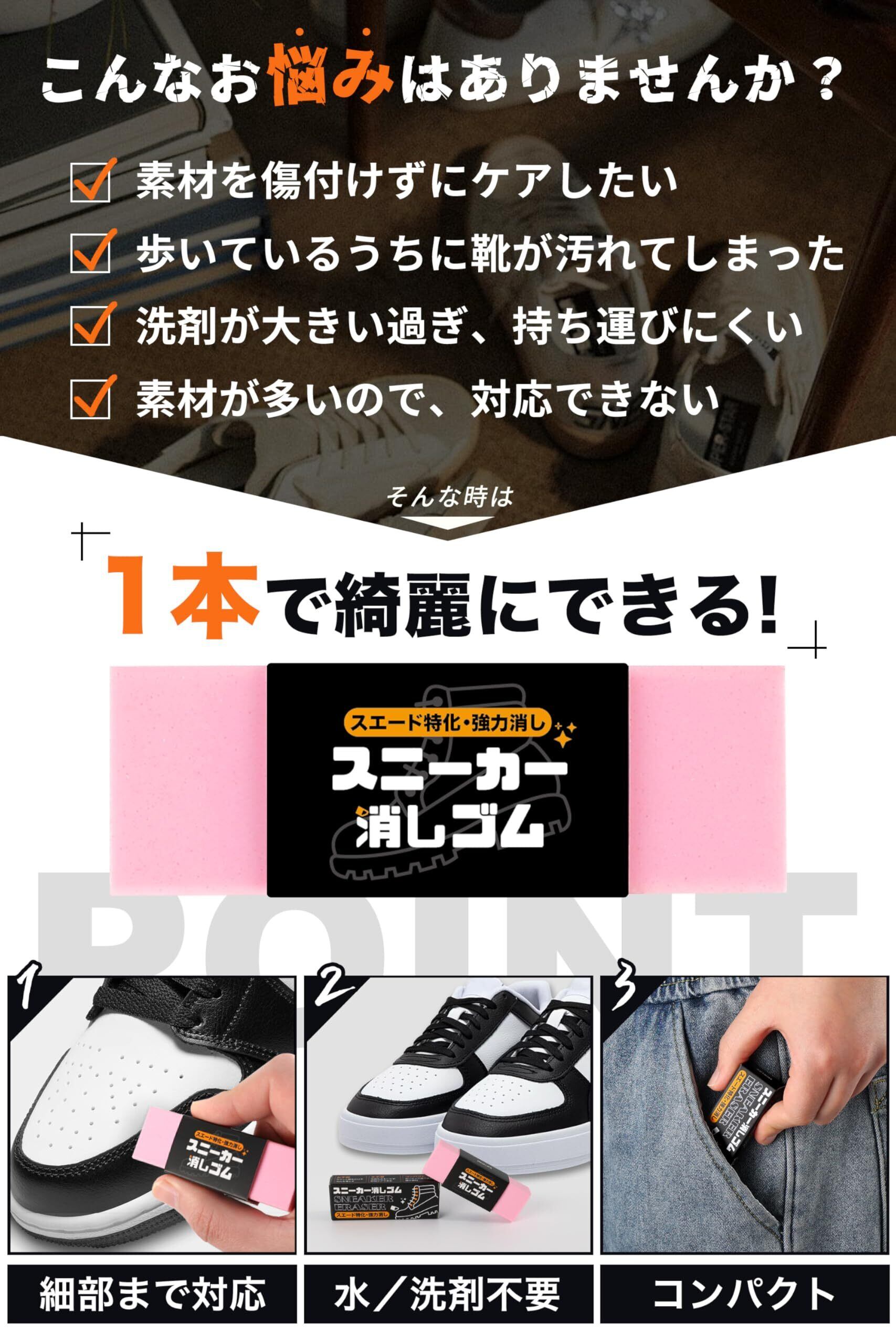 「スエードの靴をもっと美しく保ちたい方に『スニーカー消しゴム』のご紹介です!」この消しゴムは、特にスエード素材専用に設計されており、手軽にお手入れできるアイテムです。水や洗剤を使わずに、簡単に汚れを落とし、黄ばみを取り除きます。