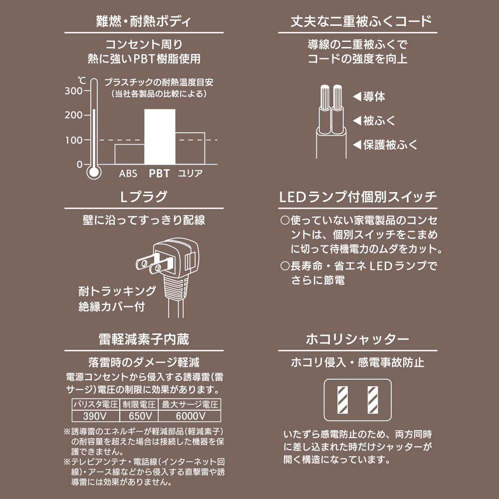 【 特 長 】 ◆精密機器を雷から守る雷ガードつき電源タップ ◆雷軽減素子内蔵で落雷時のダメージを軽減 ◆LEDランプつき個別スイッチで使わないコンセントをこまめに切って節電対策 ◆コンセント周りに熱に強いPBT樹脂を使用した難燃・耐熱ボディ ◆丈夫な二重被ふくコード ◆L型プラグで壁に沿ってすっきり配線 ◆ホコリの侵入を防ぐホコリシャッターつき ◆両方同時に差し込まれた時だけシャッターが開くいたずら感電防止構造