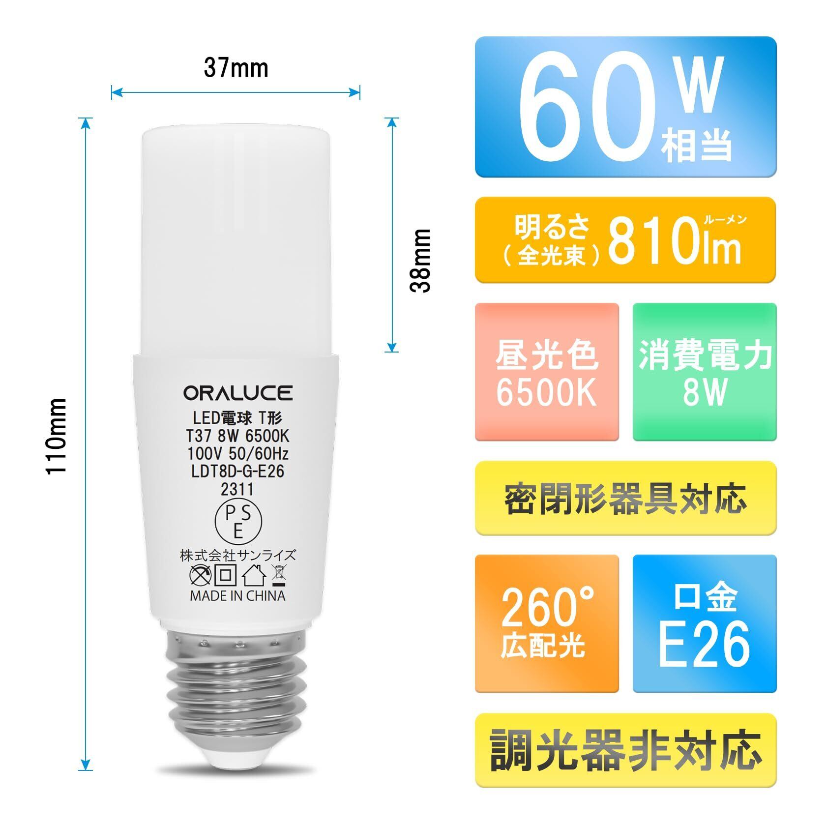 【人気商品】ORALUCE T形タイプ LED電球 E26口金 60W形相当 昼光色 6500K 8W 810LM 全方向タイプ 調光不可 断熱材施工器具対応 電球形蛍光灯EFD15 EFD25代替推奨 6個入 LDT8D-G-E26