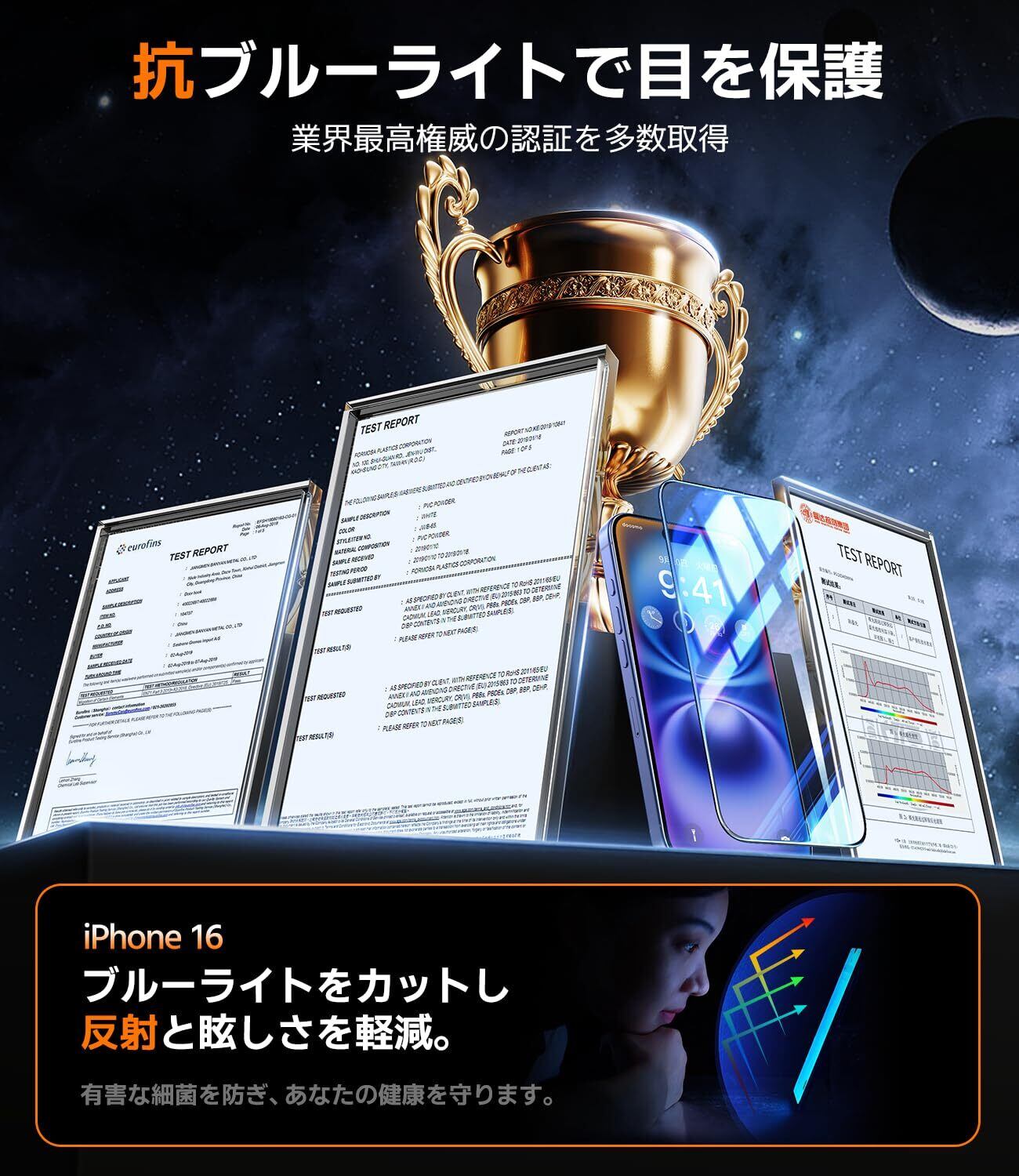 【超クリアなロスレス画質&健康を全面的に守る】このiphone用の16 フィルムは、新しくアップグレードされた高透過率素材を採用し、高透光率、スマホ画面のオリジナルの高精細な画質を再現、超クリアな視覚体験を提供しますまた、弊社のいphone16 ガラスフィルムは、国際認証のブルーライト防止テストと抗菌テストをクリアしていますガラスフィルム表面のAnti-Reflective/Anti-Blue Lightコーティングにより、ブルーライトをカットし、長時間や夜間にスマホを使用する際、ブルーライトが視網膜に与える潜在的なダメージを防ぎます 目を大切にさらに、最新のナノ抗菌技術を採用し、表面に付着する99.9%の細菌を強力に抑制しますお子様も安心して触れることができ、あなたとご家族の健康を全面的に守ります。