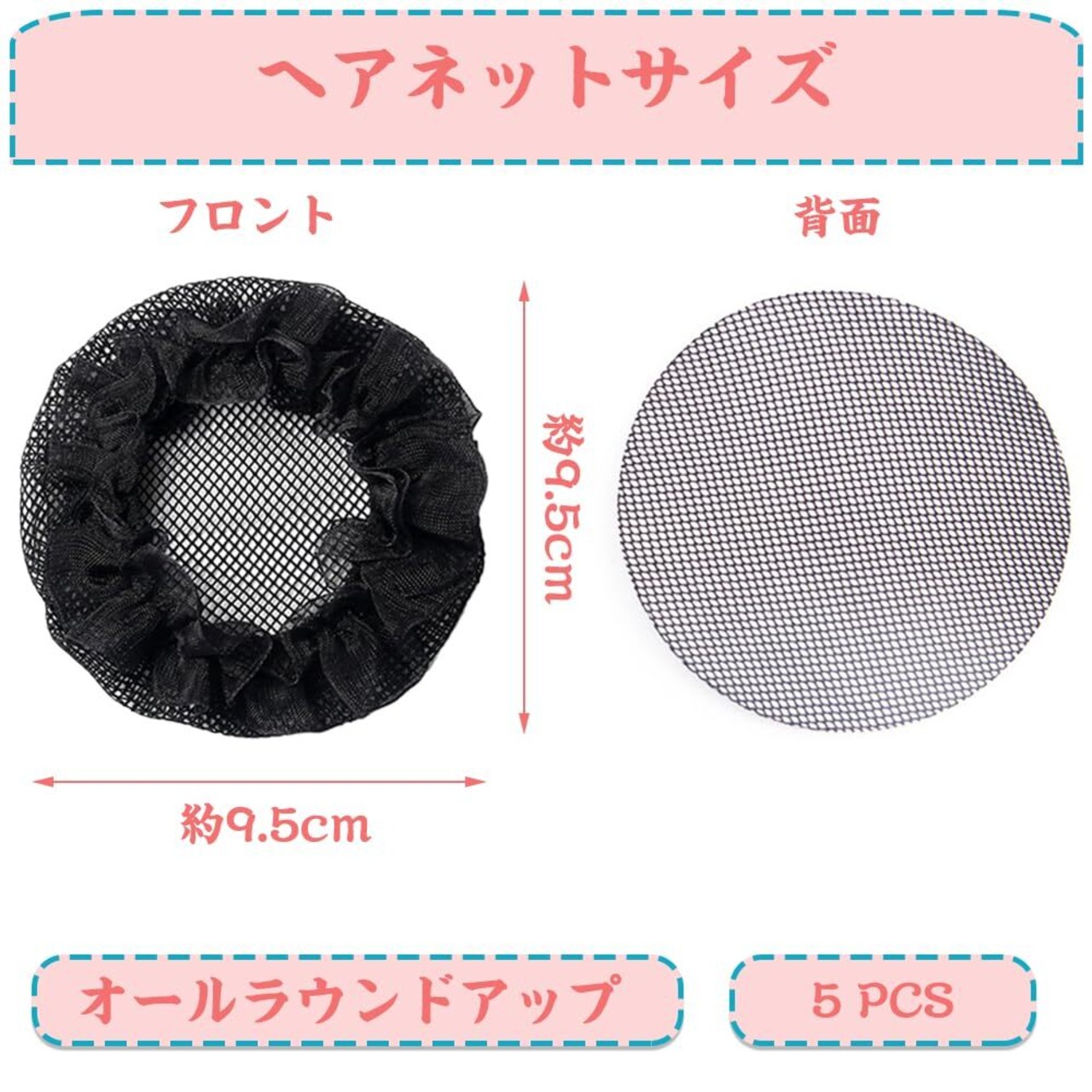 ヘアネットサイズ:約9.5cm;素材:弾性布帛;カラー:ブラック,5個セット。