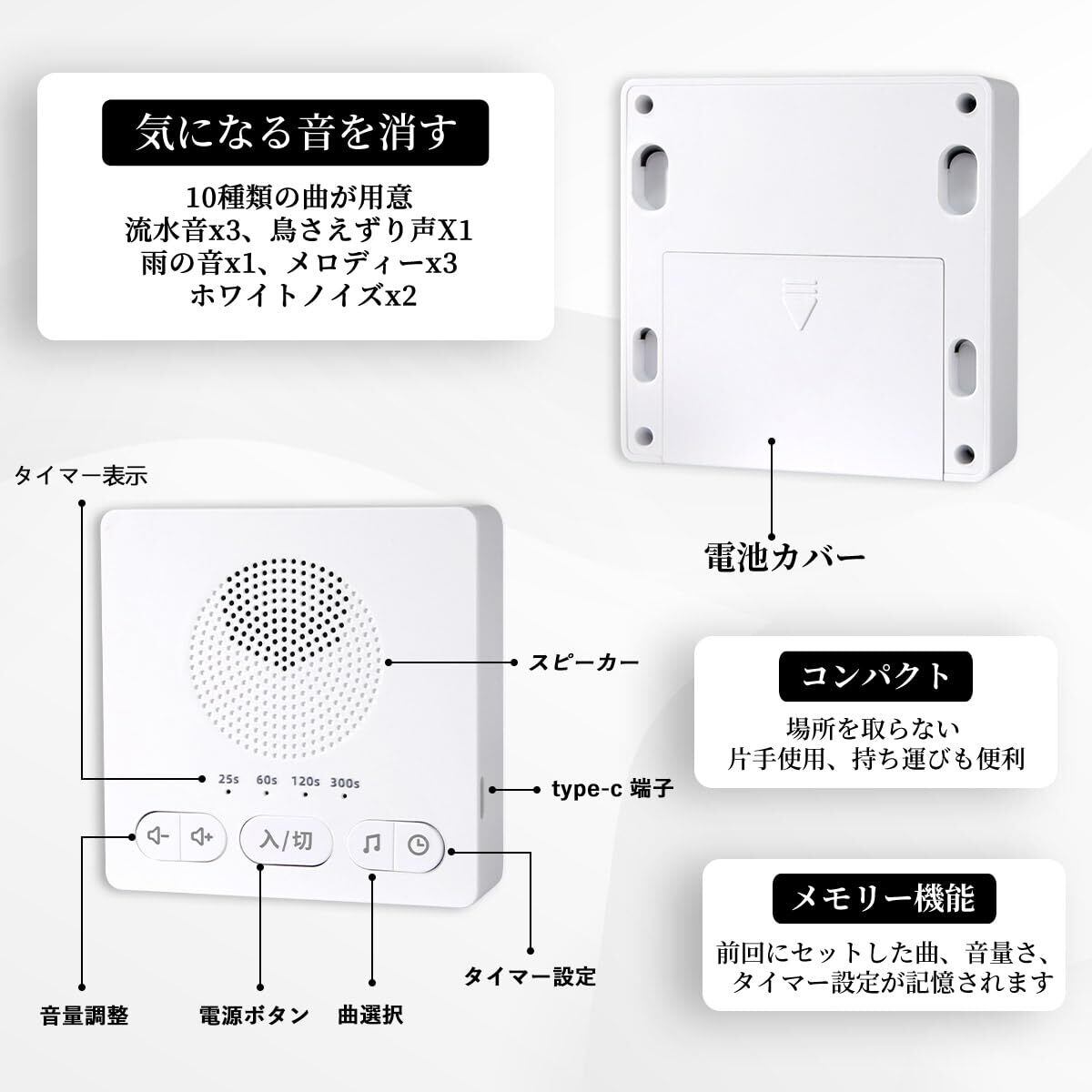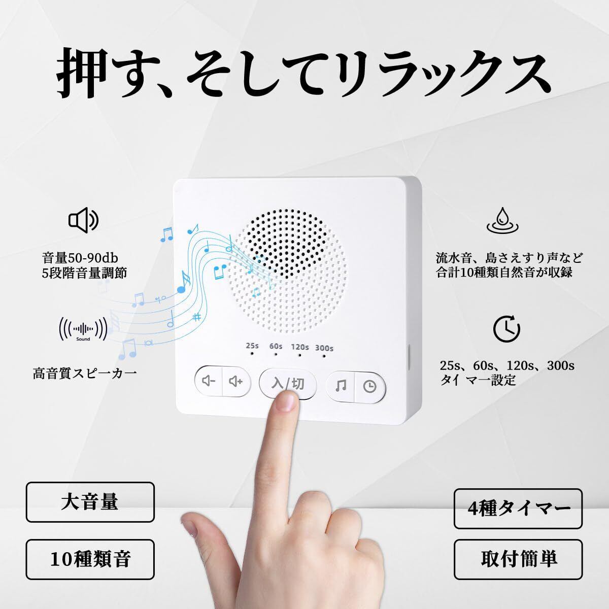 【10種類の音消し音】高品質なスピーカーを採用し、10種類の音消し音が用意されます。流水音を含め、ホワイトノイズ、トイレの流し水音、鳥のさえずり、雨音、軽音楽などがあります。気になる音があれば、ボタンを押すだけでご使用いただけます。