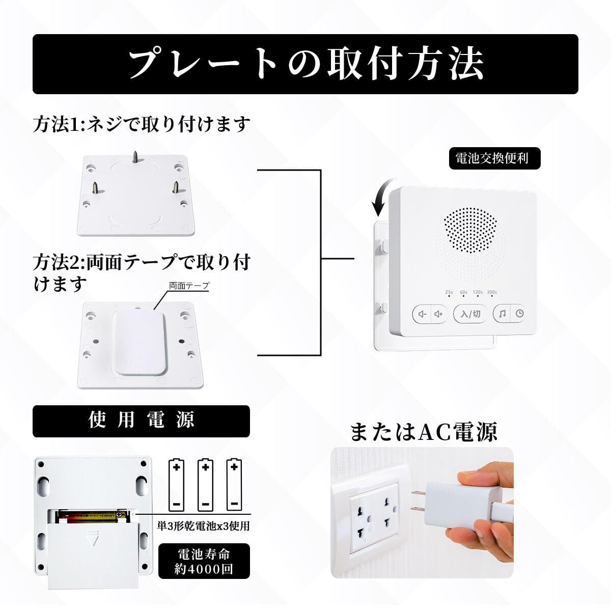【取付簡単】本製品には後付けプレートが付属しており、ネジまたは両面テープでプレートを取り付けできます。取り付け完成後、機器を自由に差し替え、電池の交換も簡単です。本体はコンパクトで、平面上に直接置くこともでき、携帯することも可能です。