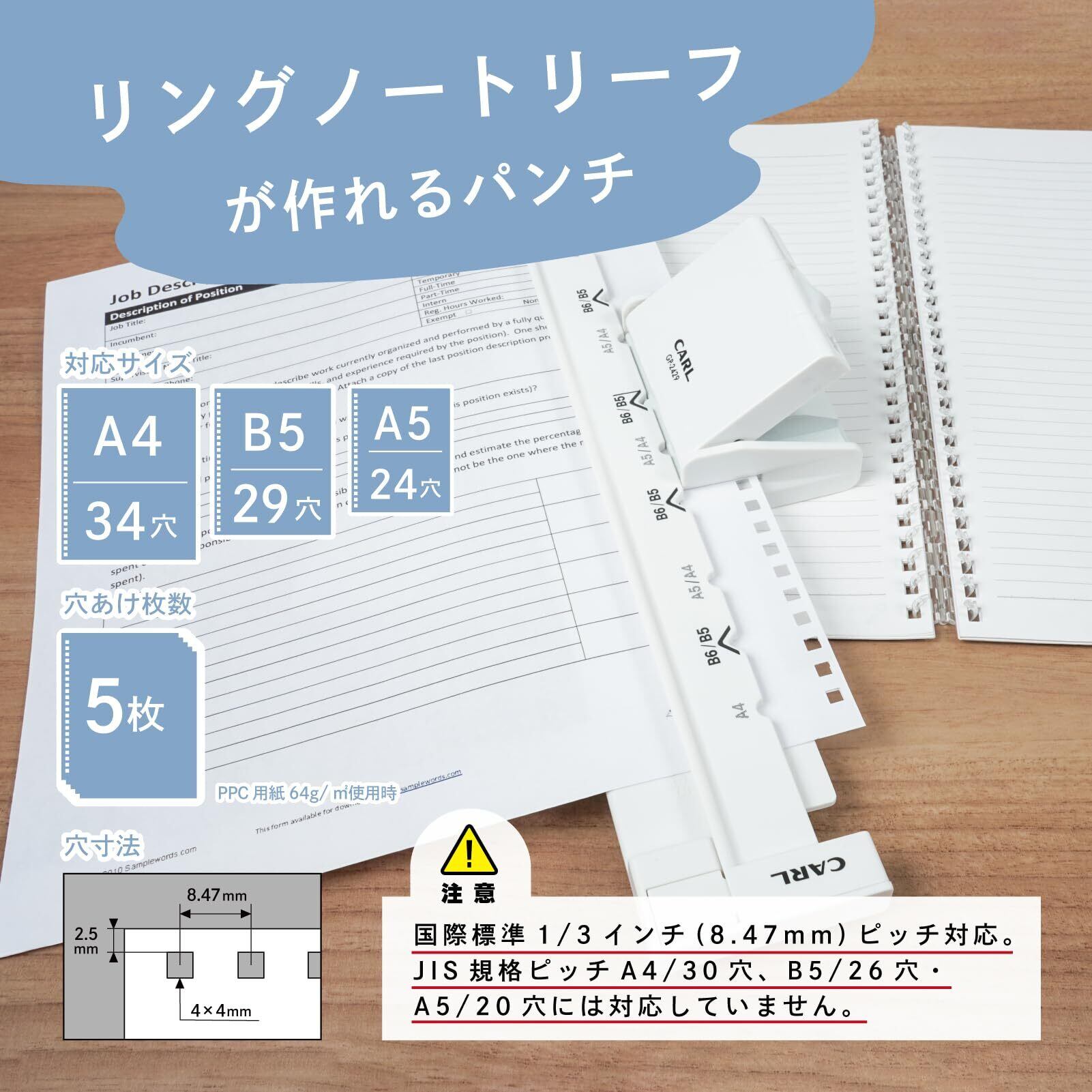 特徴:リングノート用ゲージパンチ、1/3インチピッチ、角穴、A4/34穴・B5/29穴・A5/24穴、5枚まで対応