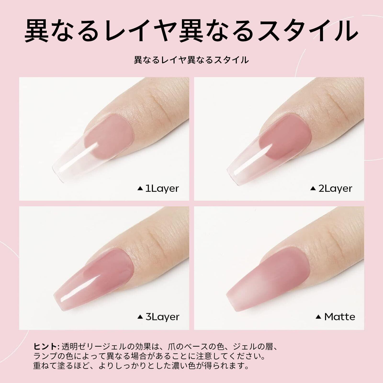 透明感のあるシアーカラー:ゼリーな質感にこだわったネイルジェル、透明感たっぷり。馴染みのよいカラーで、指先を上品に彩ります。通勤通学、結婚式、イベント、ハロウィンなど、様々場合に適用します