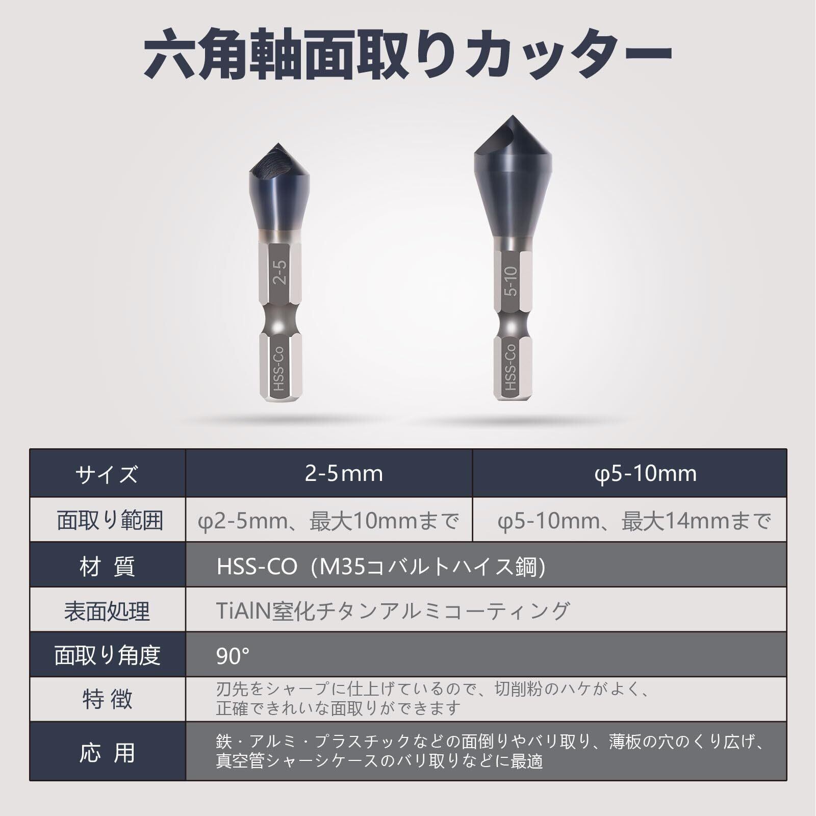 特徴:コバルトハイス鋼M35、口径2-5mm・5-10mm、六角軸、バリ取り機能、ステンレス・アルミ・木材に対応