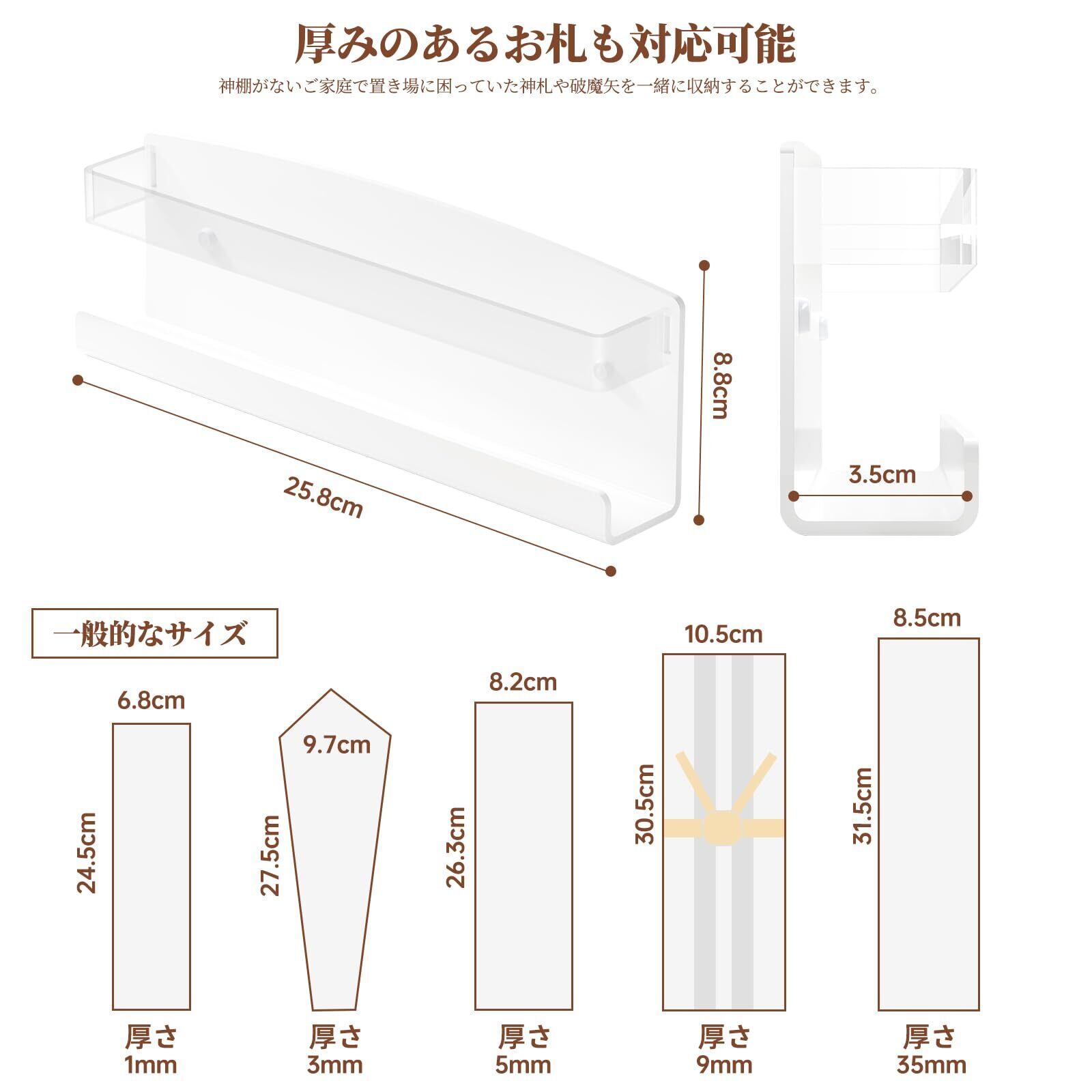 【設置可能な場所】木ネジで取り付け可能は壁:柱・かもい・板壁・プリント合板。石こうボード用プッシュピンで取り付け可能な壁:壁紙・布壁紙・ビニール壁紙貼りなどの石こうボード。寸法:長さ26×幅4×高さ9cm、内寸24.5×3.5cm。付属品は3本の石こうボード用プッシュピンと3本の木ネジです(神棚写真にイメージでお祀りの御札や御朱印帳などの付属はありません。)