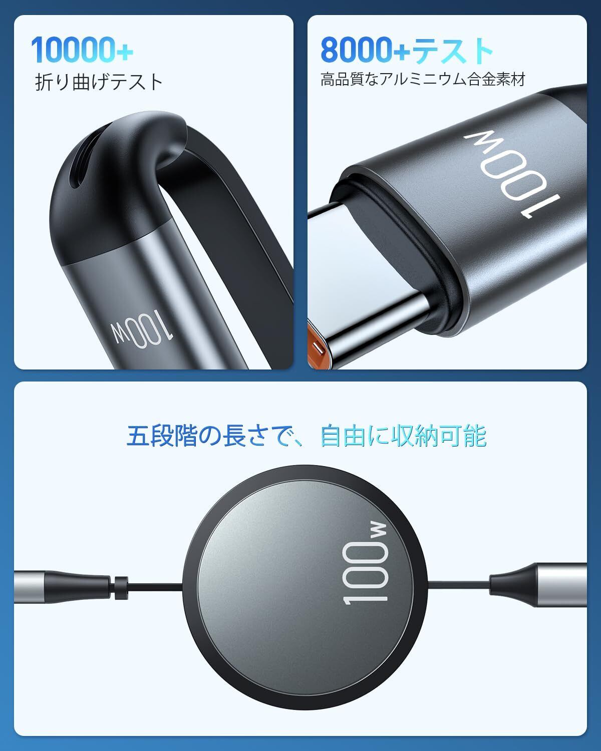 【3in2巻き取り式充電ケーブル&最大100W充電対応)】本製品は、100W対応のUSB-C巻き取り式充電ケーブルです。2in1のUSB-A/USB-C入力ポートと、3つの充電ポート L/タイプ C/マイクロ USB)を搭載しており、ケーブルの絡まりを解消します。2in1入力ポートはUSB-AとUSB-Cの2種類の充電器と互換性があります。※注意:Type-C出力ポートのみが最大100Wの充電と480Mbpsのデータ転送をサポートします。それ以外のポートは充電専用です。USB-C to USB-Cケーブルは最大100Wの充電速度を提供し、Samsung Galaxy S23/S22を30分で80%まで充電可能です。高速充電を体験するには、60W以上の充電器をご使用いただくことをお勧めします。なお、実際の充電速度は、お使いのデバイスと充電器によって異なります。ご注意:100W超高速充電実現の場合は100W充電器をご使用ください。