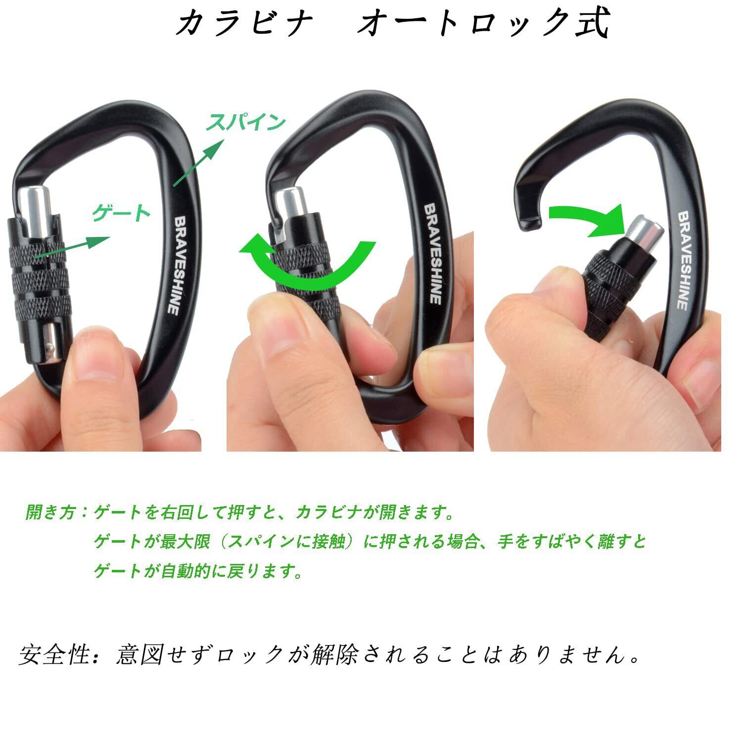 カラビナ 12KN オートロック式 BRAVESHINE 耐荷重1200kg ロックカラビナ Dリング 軽量 ハンモック タープ キャンプ用 荷物のフック 犬のリード用 多機能 2個セット