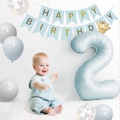 特徴:大きな数字風船、王冠バルーン、くすみブルー、誕生日用