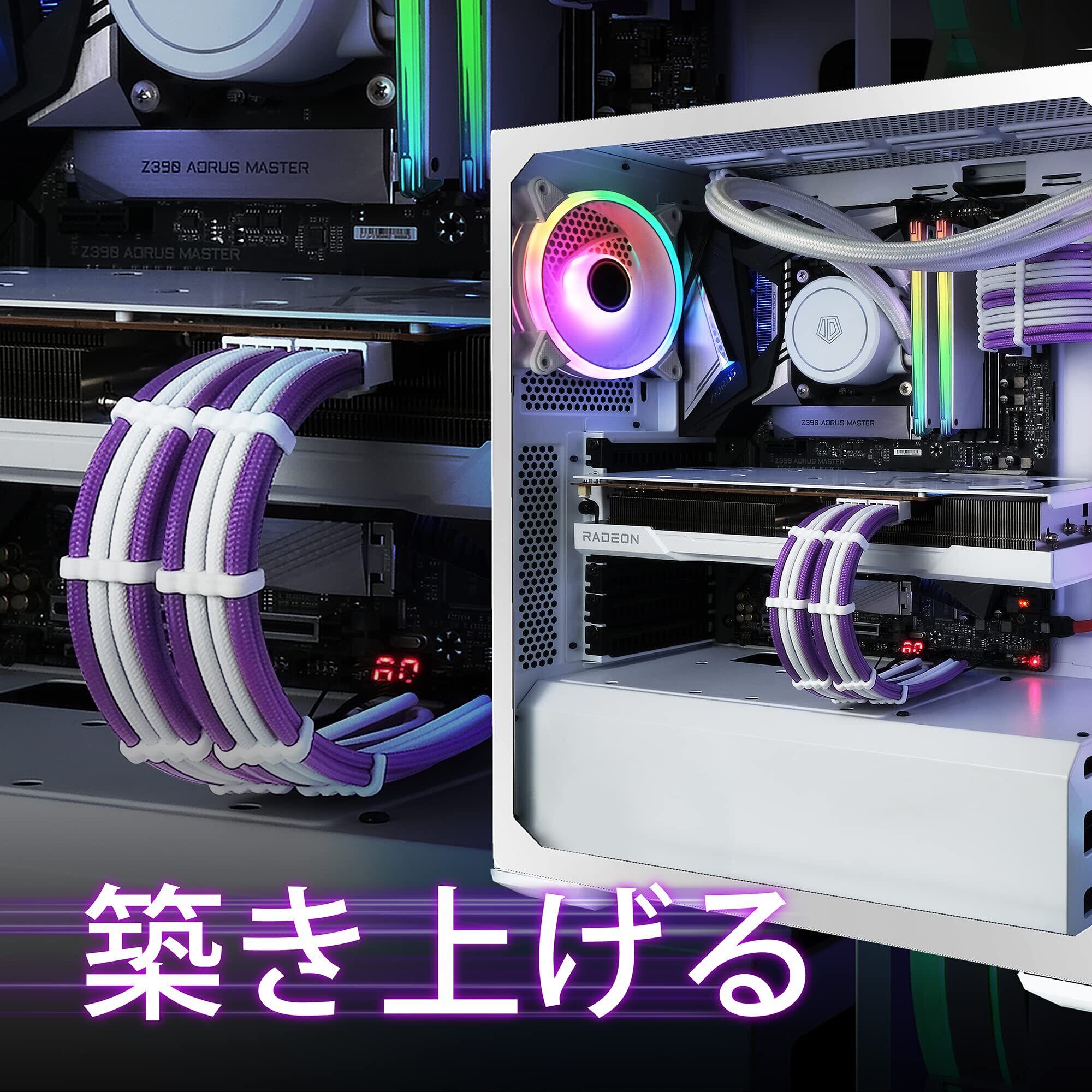 - **美しいスリーブ**: 白と紫のスリーブが施されており、見た目にもこだわったデザインを実現。おしゃれな内部配線で、PCケースのインテリアを引き立てます。