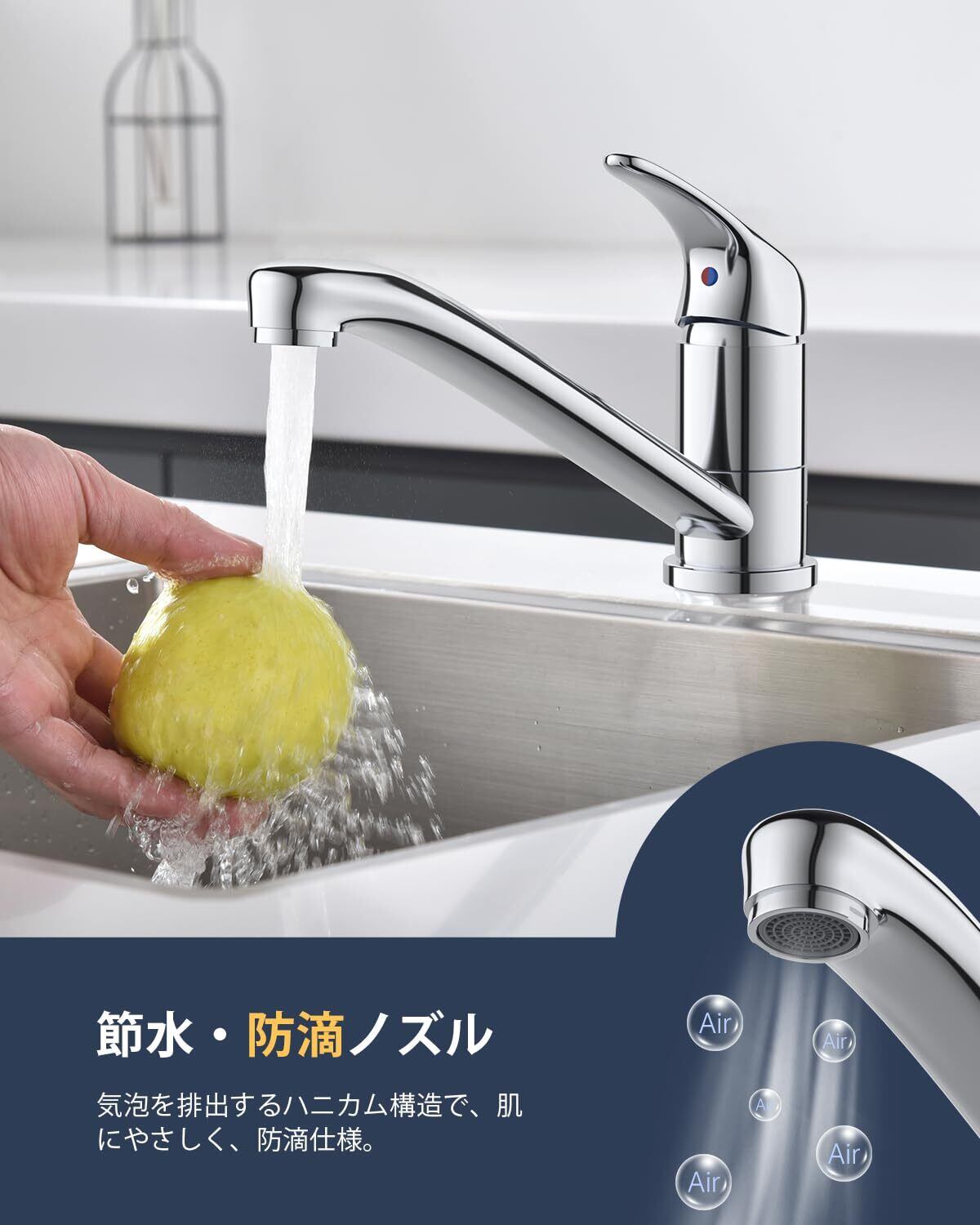 優しい泡立ち、飛び散らず洗える:酸素を豊富に含んだ吐水モード、優しい水しぶき、コップ鍋などの水受けに使える