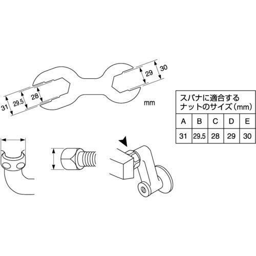 壁付混合栓拡大表示水栓補修にTOTO社製混合栓もOK。 5サイズのナットに対応。水栓が故障した際や、取替えに使用するスパナ。 5サイズ対応混合栓の水モレ補修に水栓のお取替えに水栓の分岐に 万能水栓スパナ 対応するナット混合栓の水モレ補修や水栓のお取替えに。これ一つで対応可能。対応ナットサイズ:28mm、29mm、29.5mm、30mm、31mm準備と確認作業の前に止水栓を閉める。止水栓を閉めずに作業をすると、水が噴き出し財産損害の恐れあり。 (止水栓の場所は水道局にお問い合わせください。)水栓のナットなど、使用部分にキズが付く恐れがあるときは、布などを巻いた上から使用するとよい。
