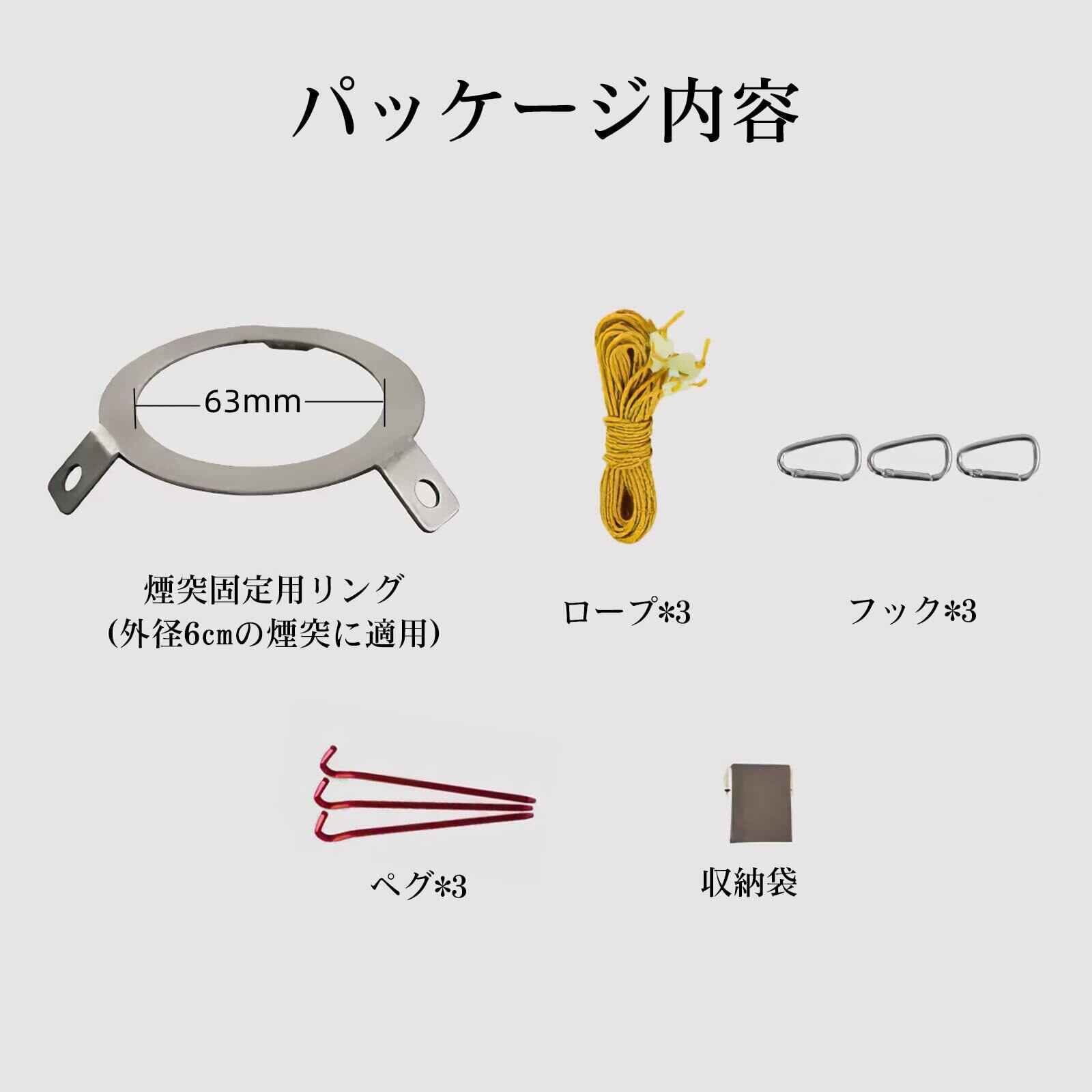 煙突固定用専用部品 セット内容:煙突固定用リング*1、フック*3、ペグ*3、ロープ*3、収納袋*1