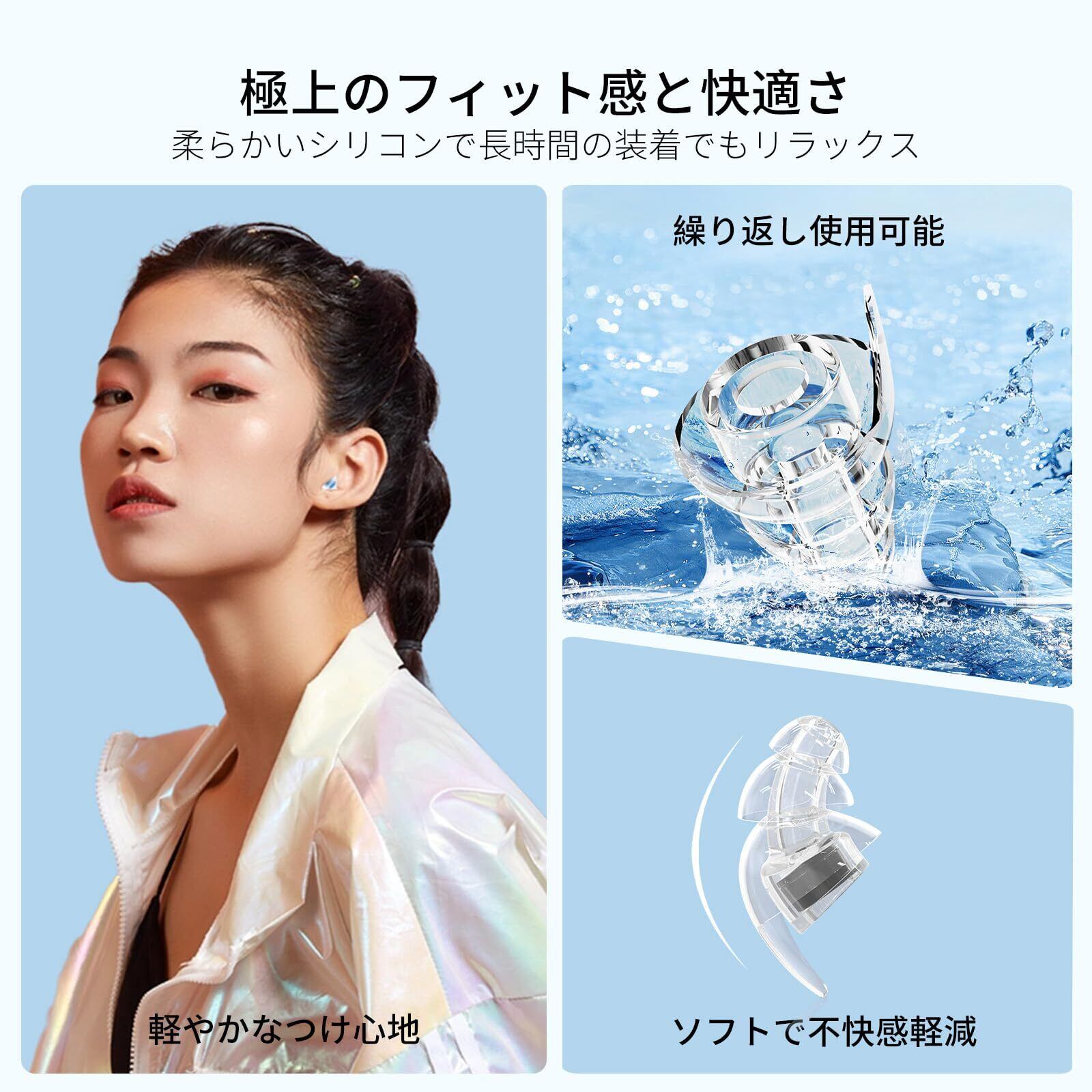 【2種類の耳栓 快適なつけ心地】2種類の耳栓を入れ、自分の耳に合う耳栓を選んでご利用いただけます。また、色の異なる2ペアのフィルターをご用意、自分の好みに合わせて自由に組み合わせられます。耳栓は、人間工学に基づいた画期的なデザイン、ユニークな形で耳穴に吸い付くようなフィット感があり、快適なつけ心地です。また、シリコン素材を採用され、柔軟性抜群で、長時間装着しても耳が痛くなりません。中空設計で、良好な通気性も発揮して、装着時の不快感や、耳に水が入ったような閉塞感はありません。