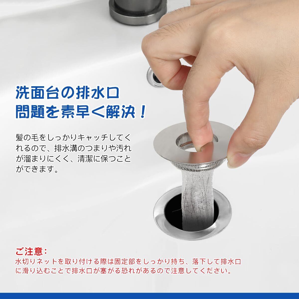 【商品仕様】:材質:ステンレス製、髪の毛キャッチャーX1個;固定部X1個;髪の毛キャッチャーネットX 100枚 (口径3.5-4.5 cmの排水口に対応して) 水切りネットを取り付ける際は固定部をしっかり持ち、落下して排水口に滑り込むことで排水口が塞がる恐れがあるので注意してください。