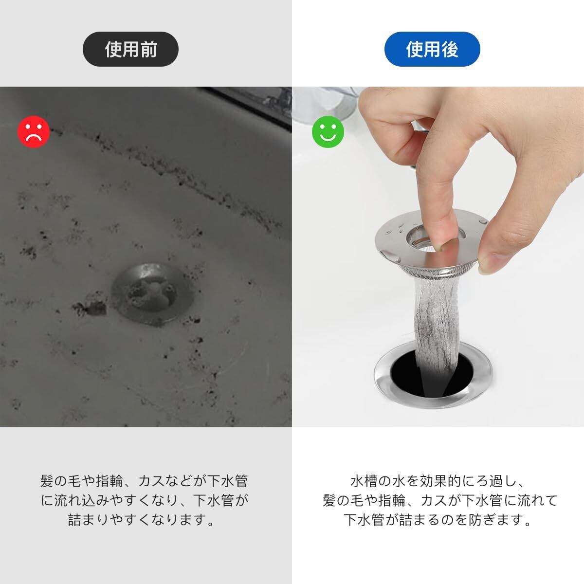 【掃除から解放】:髪の毛キャッチャーにネットを装着することで、洗面台の髪の毛や細かいゴミをしっかりキャッチします。お掃除の際はネットを取り替えるだけなので、掃除作業が減り、面倒だった排水口のお掃除が楽になりました!