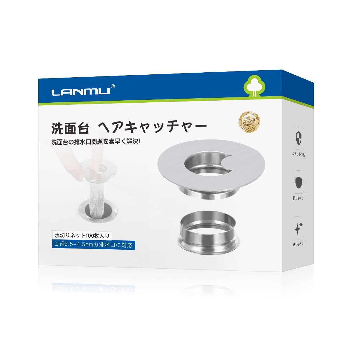 LANMU 洗面台 ヘアキャッチャー 洗面台 排水口 ゴミ受け ステンレス製 洗面所 排水口ネットホルダー 100枚 水切りネット付き 髪の毛キャッチャー 排水溝 掃除 特許出願中