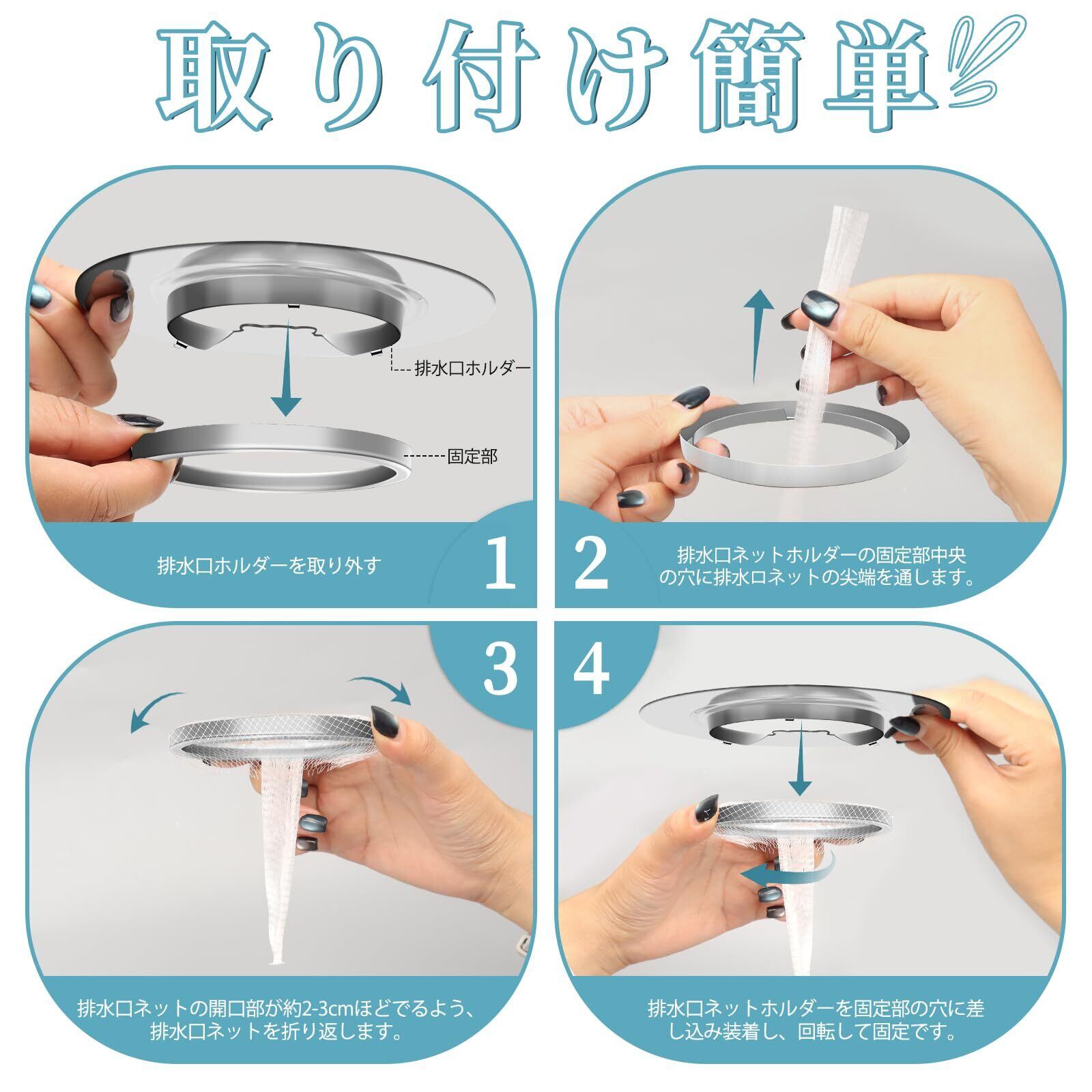 【仕様】: 口径約10cm排水口対応。※注意:購入前に排水口の口径は9.5cm以上確保してください。パッケージ内容:お風呂 排水口ネットホルダー X 1個;固定部 X 1個;水切りネットX 100枚