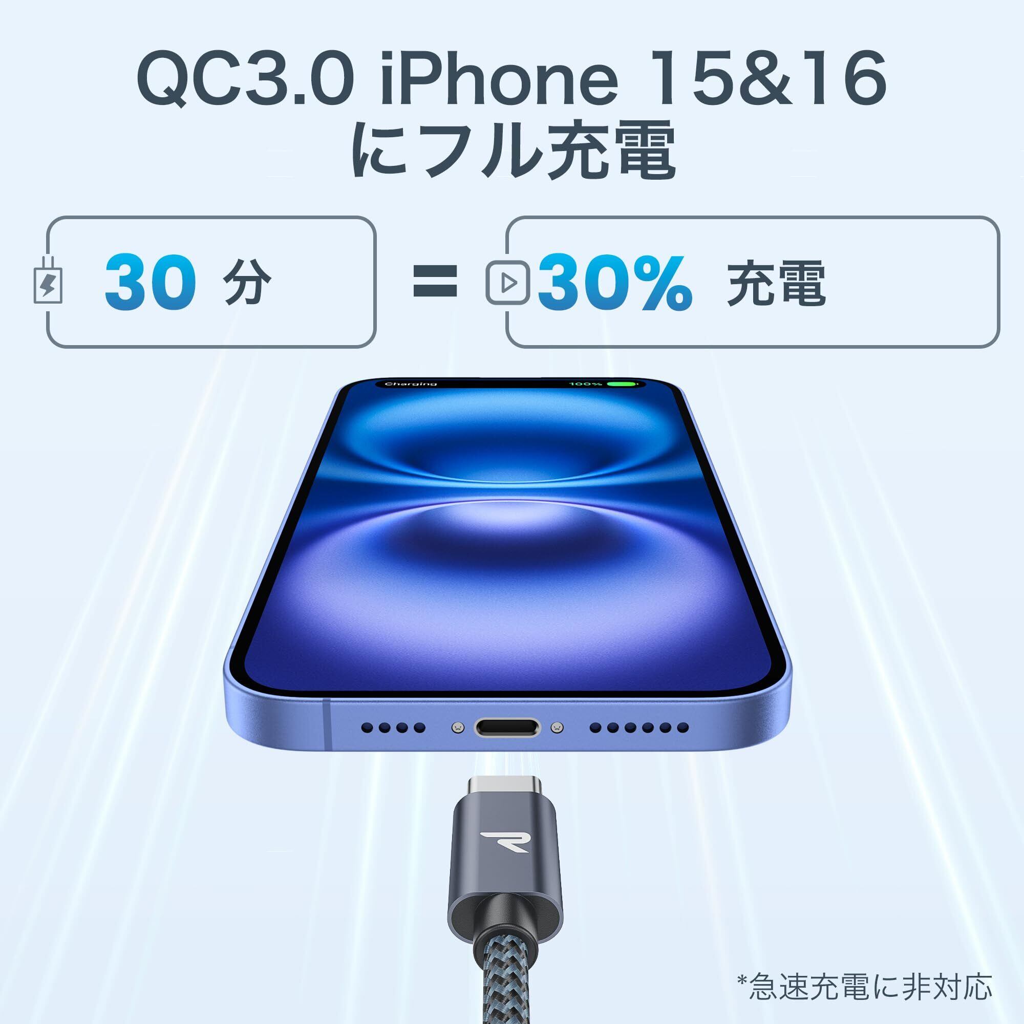 【快適なフルスピード充電】️️iPhone 15/16シリーズのスマートフォンを充電する場合、充電電力は12Wで、急速充電には対応していません。 当社のUSB CケーブルはQC3.0対応、3.6V〜5V/3Aのフルスピード充電が可能です。▲充電器と充電機器がQC3.0対応している場合に限ります。※ iPadとMacbookに充電する際に、15W以上のUSB-A充電器の使用を推奨いたします。