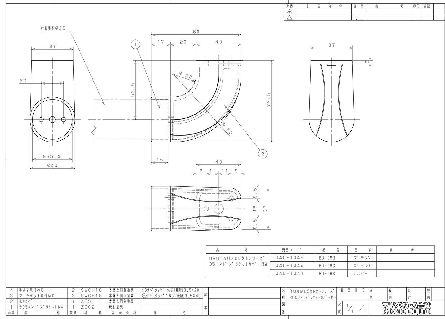 【数量限定】マツ六(Mazroc) 手すり部材 BAUHAUS セレクト 35エンドブラケットカバー付 BD-08G ゴールド