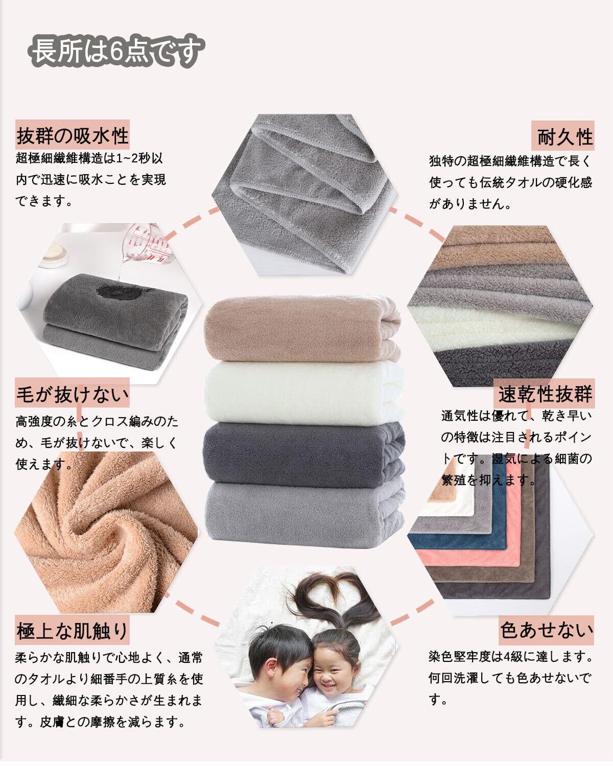 【抜群の吸水性と速乾性】綿の素材より吸水性が優れます。マイクロファイバー素材の表面は数えられない隙間があり、その隙間に大量の水分を素早い吸水できます。髪や肌にそっと当てるだけで水分が吸収される素材であり、また汚れも落としやすい特徴があります。隙間に取り込まれた空気が水分を拡散させるので、速乾性のポイントで、バスタオルの雑菌を抑え、健康を保つことができます。